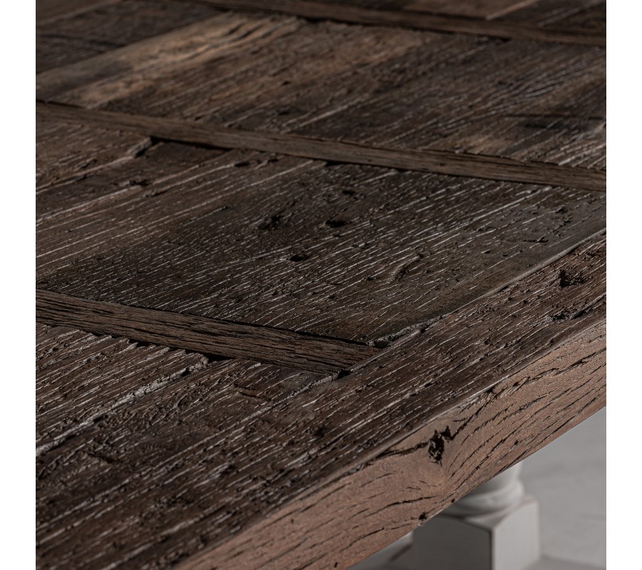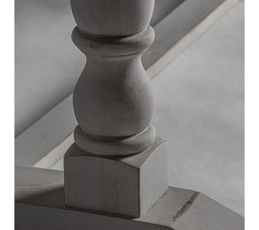 S vintage nádychom, ktorý tento stôl ponúka, sa stáva ideálnym centrálnym bodom pre rodinné večere alebo spoločenské stretnutia. Jeho vyrezávané nožičky sú príkladom remeselného umu, pridávajúcemu stolu charakter a sofistikovanosť. Nožičky stola majú povrchovú úpravu so zamerným opotrebením po okrajoch kde sa nacháza patina. Doska stola nie je opracovaná nahladko ,no tým že je štrukturovaná dodáva stolu špecifický dizajn.