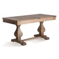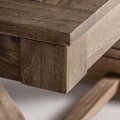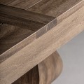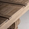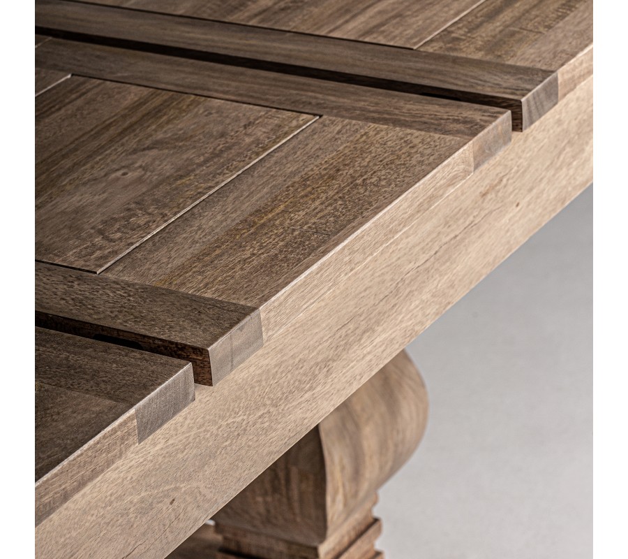 Horná doska stola je zložená z precízne opracovaných lat ,tak že majú zámerne zvýraznené hrany, z ktorých vzniká dizajnový obrazec - rám a výplň. Drevo na stole je do hladka opracované, nožičky stola sú zdobené vyrezavaným motívom, ktoré dominujú dizajnu samotného stola. Stôl posobí vďaka svetlej prirodzenej hnedej farbe dreva hrejivo a hodí sa do vidiecky ladenej jedálne, kde je možné ho skombinovať s jedálenskými stoličkami v svetlohnedom prevedení so sivým alebo šedým čalúnením a ďalším nábytkom v podobnej farbe, a ak bude jedálen mať podlahu v drevenom prevedení aj strop zdobený s dekorom z drevených trámov, tak sa vaše návštevy vstupom do jedálne prenesú pocitmi na vidiek. Bočné orámovanie hornej dosky stola pridáva stolu pocit mohutnosti.