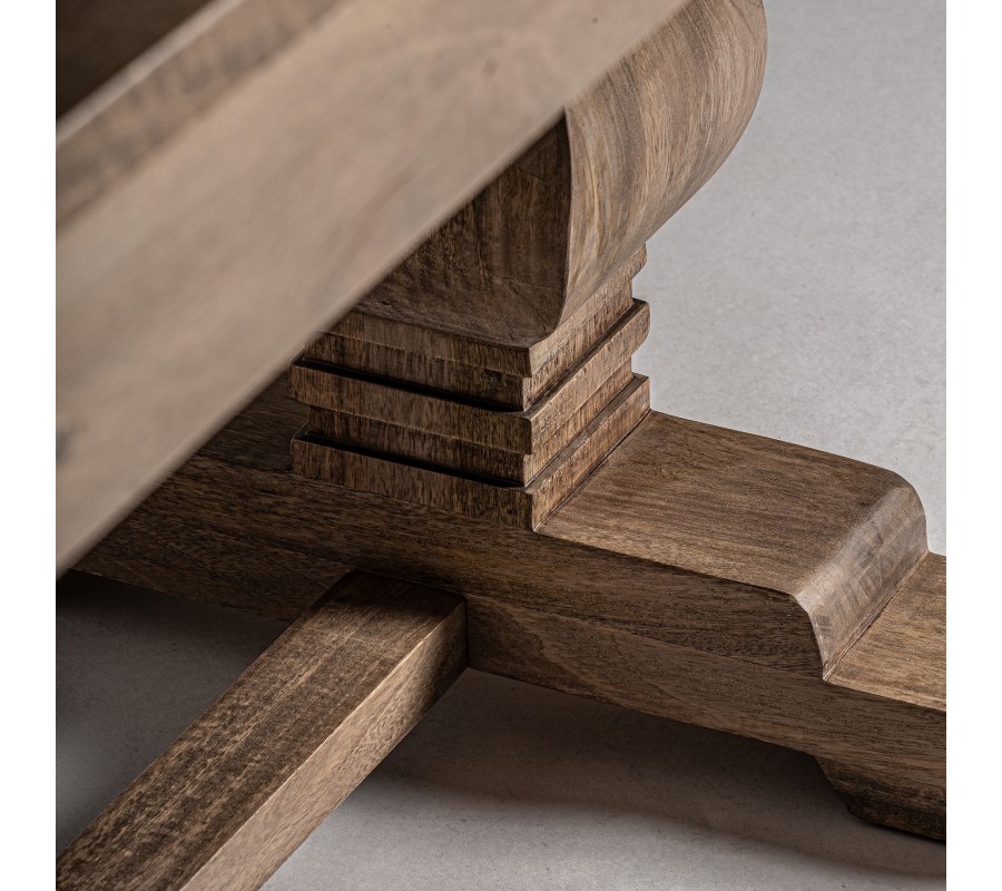 Stôl má dve nožičky, spojené jednou drevenou latou, čím sa zvyšuje jeho stabilita a zachováva elegantný vzhľad. Vyrezávanie na nožičkách nie len zvýrazňuje koloniálny štýl, ale aj pridáva jedinečný estetický rozmer, ktorý zaujme na prvý pohľad.