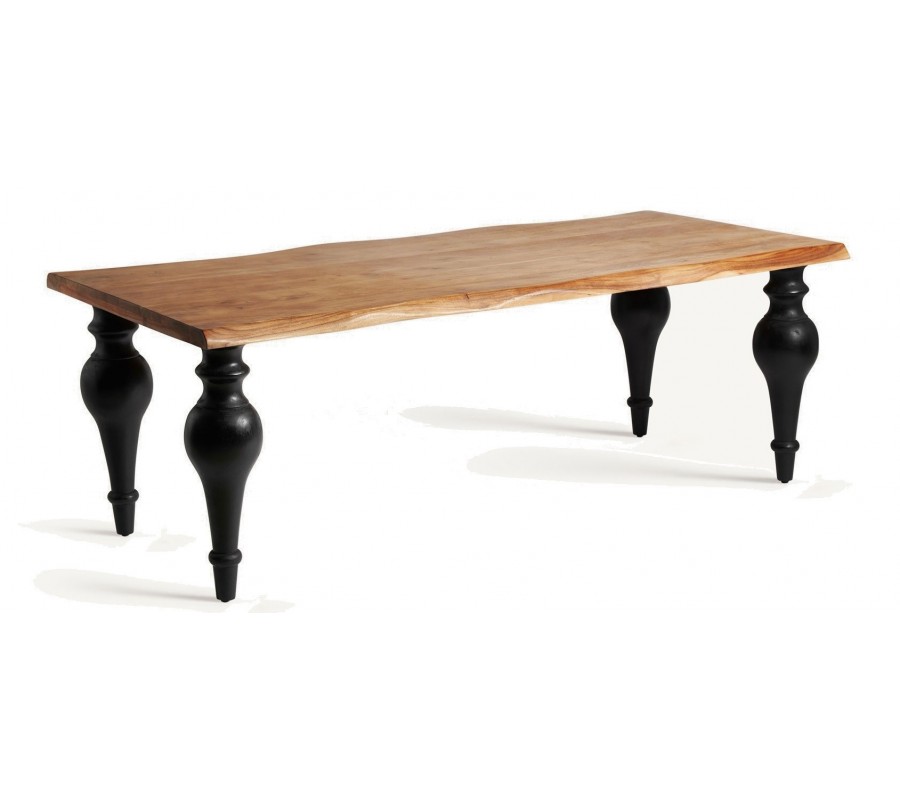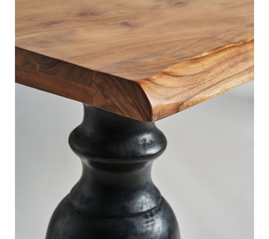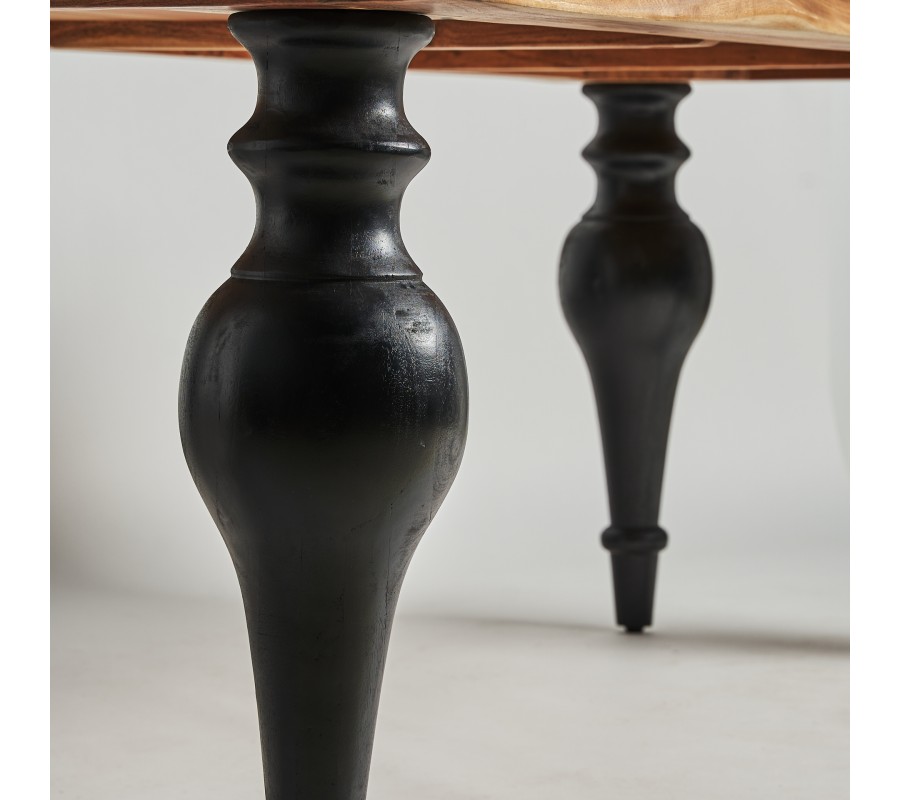 Jedálenský stôl Zena Noir v sebe spája divokú krásu masívneho dreva s estetikou vidieckeho štýlu. Bude tak majestátnym centrom vašej obývačky s originálnym vizuálom. Kombinácia čiernej a prírodnej medovej hnedej pôsobí kontrastným dojmom, no tieto dve univerzálne farby vám ponúkajú široké možnosti doplnenia do rôznych interiérov. Jedáleň v neutrálnych farbách dodáte sofistikovaný čierny akcentový prvok, ktorý môžete prepojiť s príborníkom s podobnými prvkami. Stôl však môžete doplniť aj čalúnenými stoličkami vo výraznejších farbách. Vrchná doska prináša do kompozície naturálny prvok, ktorý ešte zdôrazňuje jej nepravidelný tvar sledujúci štruktúry dreva. V štýlovom kontraste k tomu sú nožičky stola, ktoré sú inšpirované vidieckym nábytkom. Elegantná silueta je prevažne štíhla, s rozšírenou strednou časťou, ktorá pripomína tvar antickej vázy. Kombinácia klasických tvarov s naturálnymi robí z jedálenského stola neprehliadnuteľný dizajnový kus nábytku, ktorý očarí vašich hostí. Za stôl usadíte 10 osôb. Jedáleň tiež môžete doplniť ďalším nábytkom z kolekcie Zena Noir, ktorý nájdete v našej ponuke.