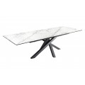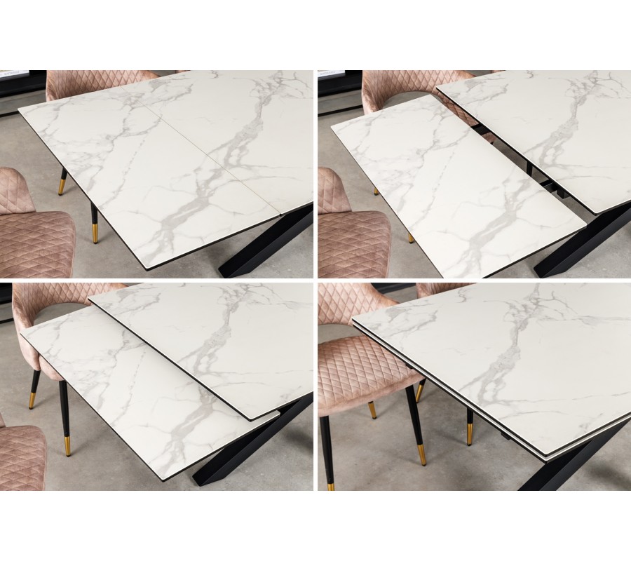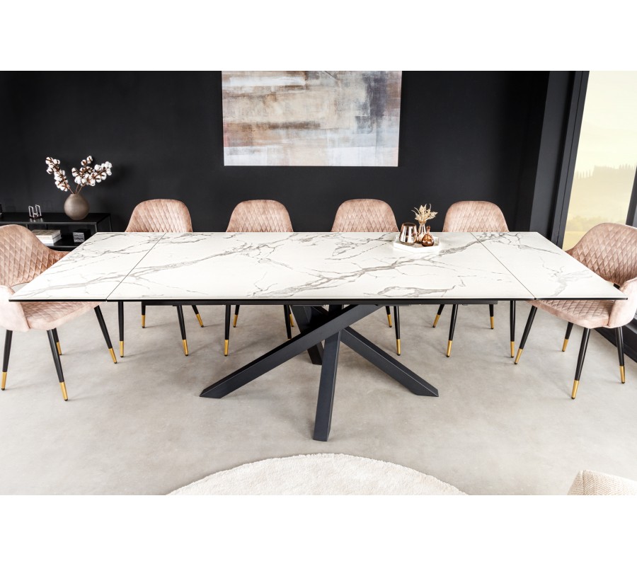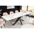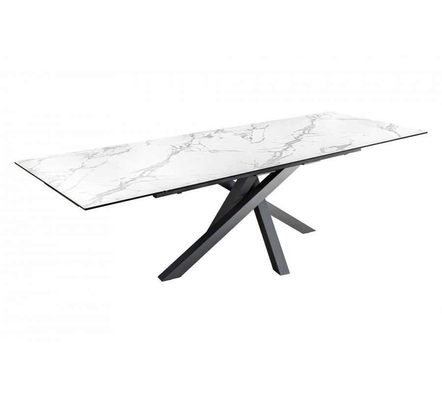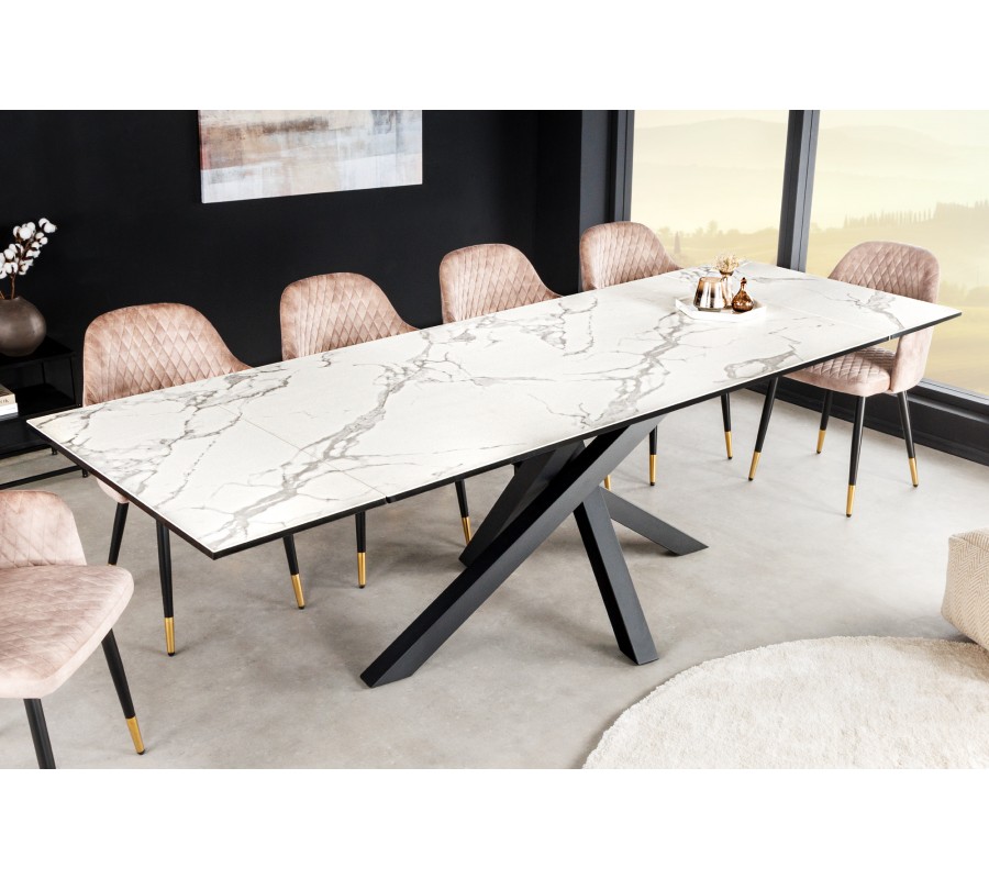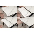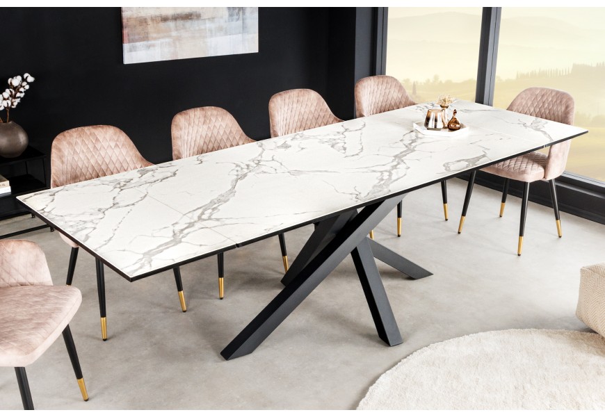 Rozkladací obdĺžnikový jedálenský stôl Ceramia s bielou doskou s dizajnom mramoru a s čiernymi prekríženými nohami 180 cm