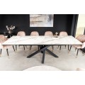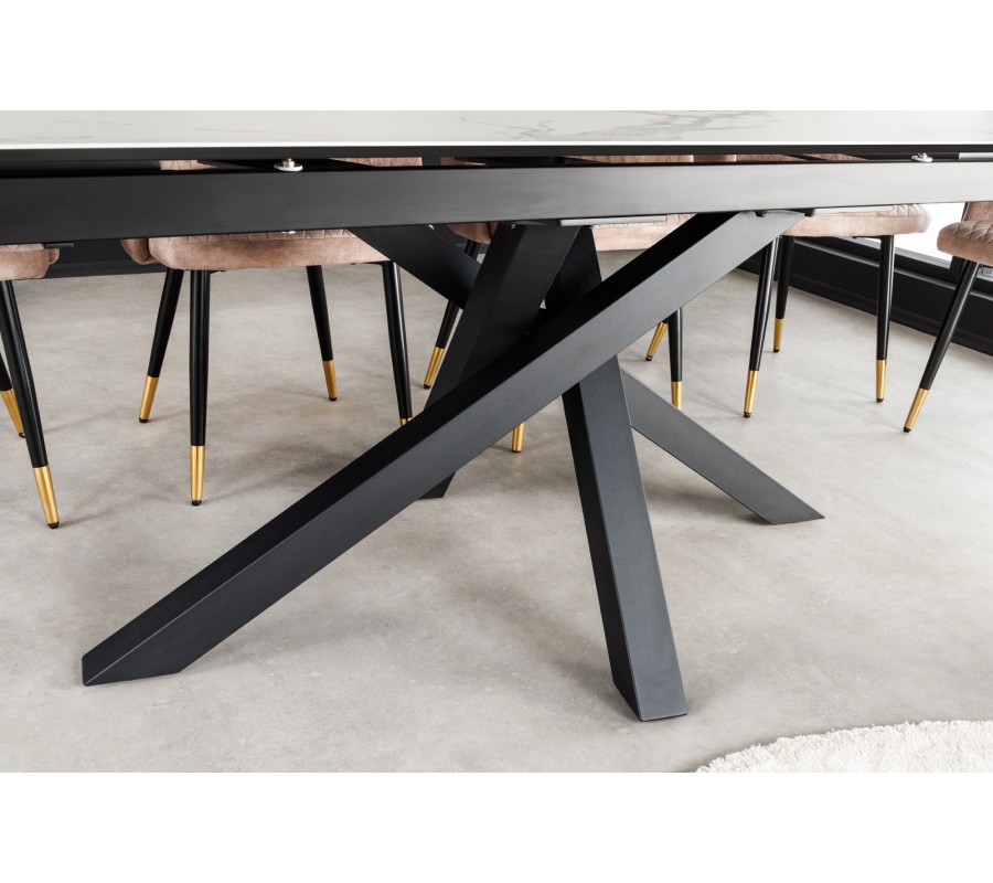 Jedálenský stôl Ceramia vás očarí svojím elegantným dizajnom a nadčasovou farebnou kombináciou. Na prvý pohľad vás upúta vrchná doska s dizajnom bieleho mramoru. Je vyrobená z keramiky a pokrytá bezpečnostným sklom, ktoré jej dodáva vysokú odolnosť a je jednoduché na údržbu. Ide o sklo upravené kalením tak, aby sa zachovali jeho vizuálne vlastnosti, no zároveň zmenila vnútorná štruktúra, čím sa stáva mimoriadne pevným. Vrchná doska je rozkladacia a na oboch koncoch je možné ju predĺžiť o 40 cm. Pri úplnom rozložení dosahuje stôl dĺžku 260 cm a usadíte za neho až 12 hostí. So sivou mramorovou kresbou sa skvele prepája čierna farba hranatých kovových nožičiek, ktoré sú prekrížené. Okrem dobrej stability pridávajú stolu aj zaujímavý vizuálny prvok. Kombinácia čiernej a bielej je univerzálna a umožňuje vám stôl doplniť nábytkom v neutrálnych odtieňoch pre vytvorenie nadčasového vzhľadu, no tiež môžete pridať aj výraznejšie farby, napríklad na čalúnení stoličiek či na koberci. Mramorový vzhľad a rovné línie odkazujú na estetiku štýlu art deco, ktorú môžete zdôrazniť pridaním lesklých zlatých dekorácií či svietidla, ktoré dodajú vašej jedálni nádych honosnosti a luxusu.