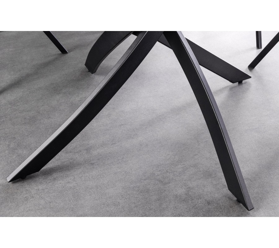 Siluete dominujú štyri prekrížené kovové nožičky. Majú plochý široký tvar a ich mierne zakrivenie dodáva spodnej časti stola zaujímavý dynamický vizuál. Jemne oblé línie korešpondujú s okrúhlym tvarom vrchnej dosky. Sú vyrobené z kovu s čierny matným práškovým nástrekom.