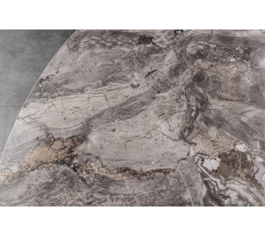Vrchná doska stola pôsobí čistým a moderným dojmom. Jednoduchý kruhový tvar necháva vyniknúť mramorovú kresbu v odtieni taupe. Týmto názvom sa označuje kombinácia sivej a hnedej v rozličných pomerom. V dizajne tohto stolíka je použitý odtieň s dominantnou sivou a jemnými podtónmi hnedej, ktoré prinášajú do kompozície teplý nádych.
