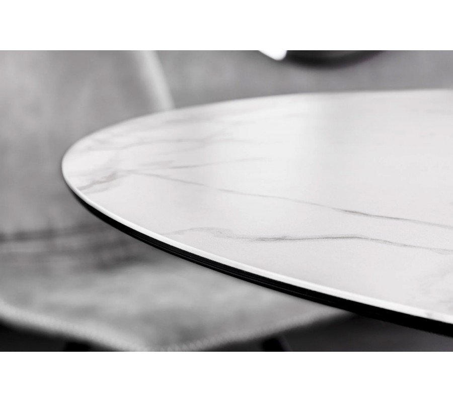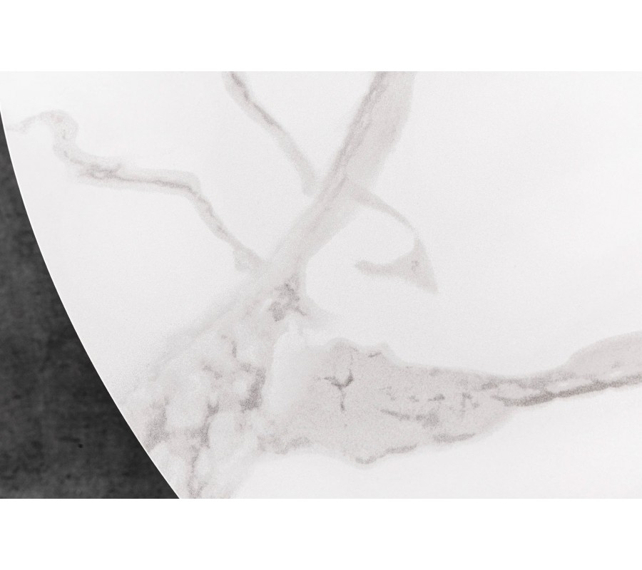 Na prvý pohľad vás zaujme okrúhla vrchná doska v bielej farbe so sivou mramorovou kresbou, ktorá prinesie do vašej jedálne nádych luxusu. Jej povrch je pokrytý bezpečnostným sklom, ktoré je nesmierne pevné a odolné. Zjednodušuje tiež údržbu stola a chráni svetlú farbu.