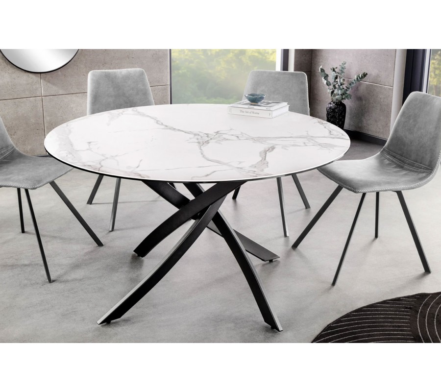 Moderný okrúhly jedálenský stôl Valldemossa s bielou vrchnou doskou s mramorovým dizajnom a prekríženými nohami 120 cm