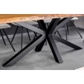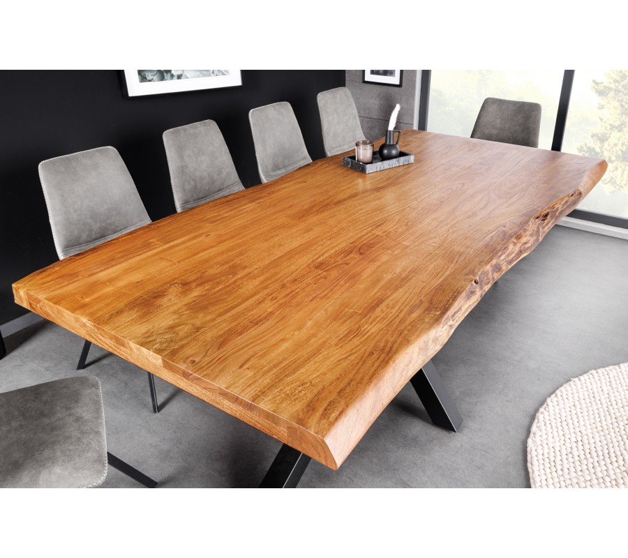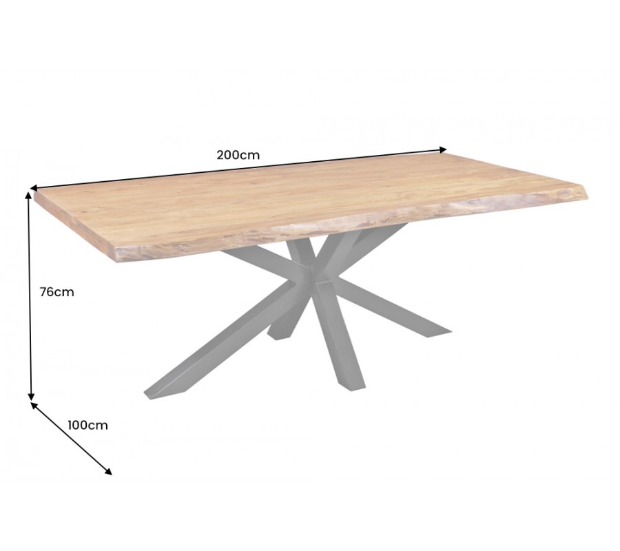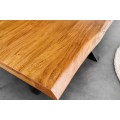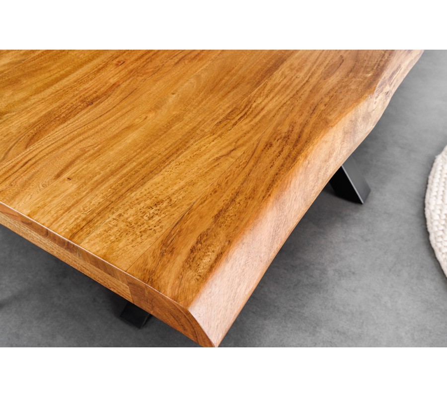 Obdĺžniková vrchná doska s hrúbkou približne 50 mm je vyrobená z akáciového dreva. Tento materiál je obľúbený vďaka svojej tvrdosti a nábytok z neho sa pýši vysokou odolnosťou. Dlhšie hrany vrchnej dosky sú mierne zvlnené a sledujú prirodzené štruktúry dreva, čo v kombinácii s výraznou kresbou letokruhov podporuje masívny prírodný vzhľad. Aj vďaka tomu je každý kus jedinečným originálom.