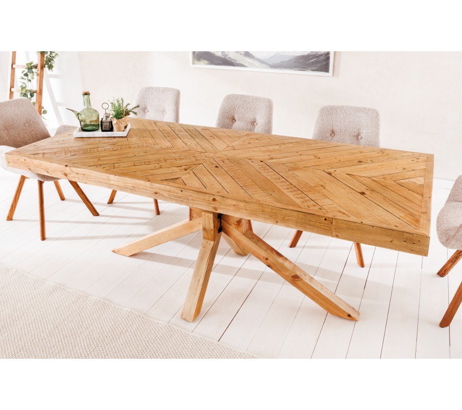 Jedálenský stôl Nina vás očarí krásou masívneho dreva a skvostnou vrchnou doskou s geometrickým parketovým vzorom. Vašej jedálni dodá naturálny dekoratívny prvok a zároveň poskytne stolovacie miesto pre 8 až 10 osôb.