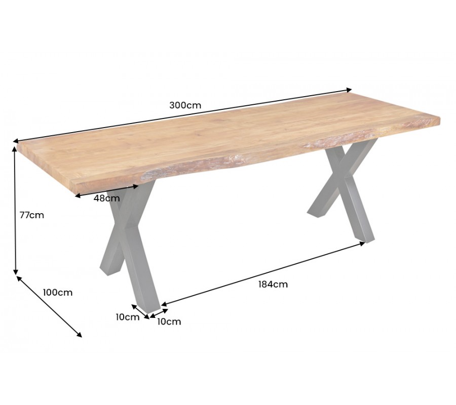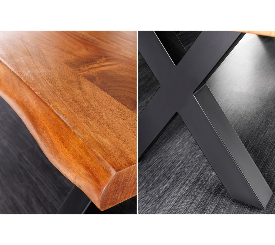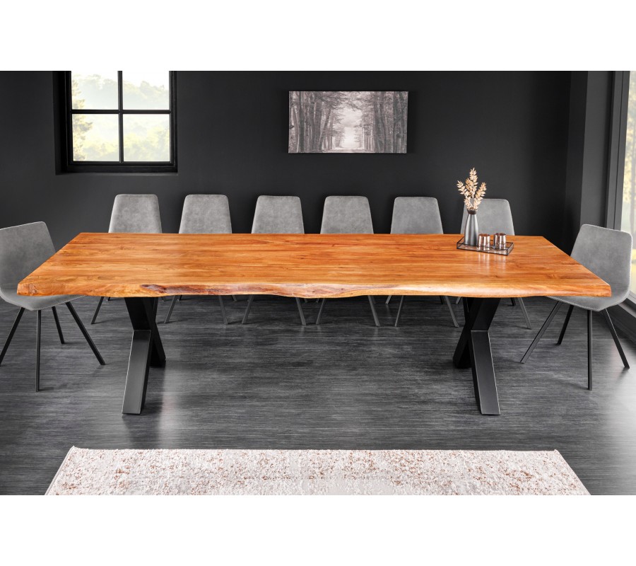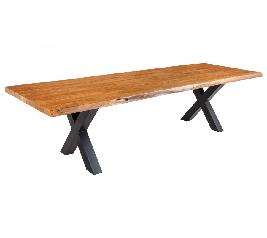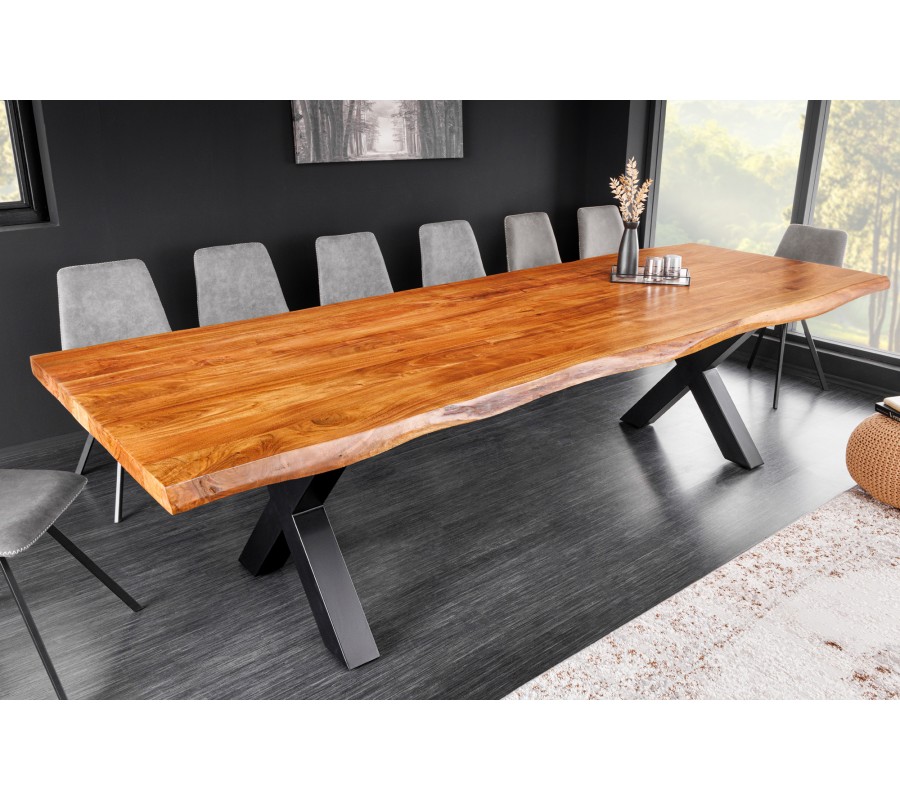 Masívny industriálny obdĺžnikový jedálenský stôl Mammut s akáciovou medovou hnedou doskou a prekríženými nožičkami 300 cm