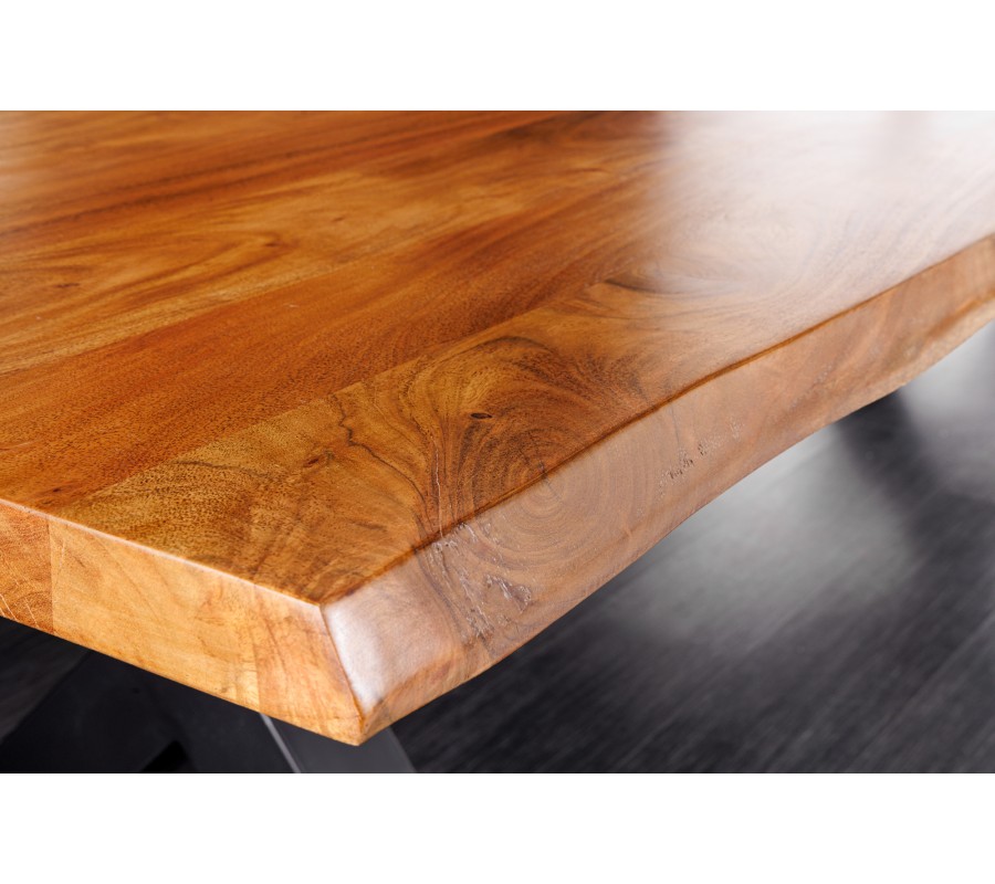 Dizajnu dominuje obdĺžniková vrchná doska z masívneho akáciového dreva. Tvar dlhších hrán je nerovný a sleduje prirodzené štruktúry dreva, čo robí z každého kusu jedinečný originál. Má príjemnú teplú medovo hnedú farbu s výraznou kresbou letokruhov, ktorá ešte zdôrazňuje naturálny charakter tohto materiálu.