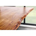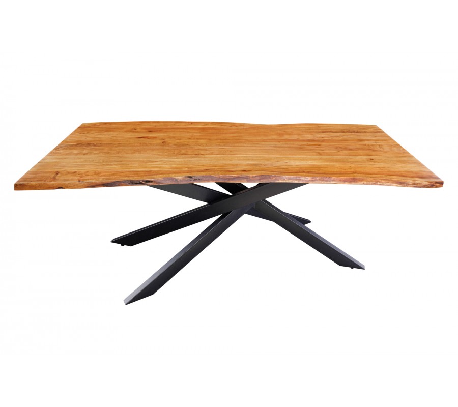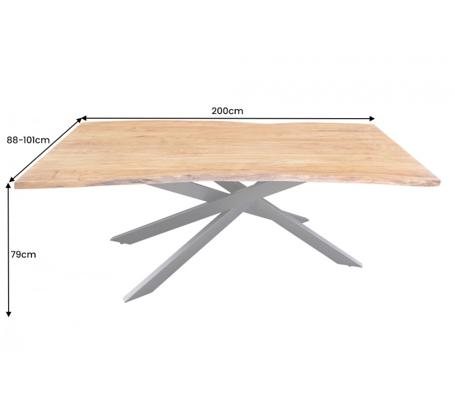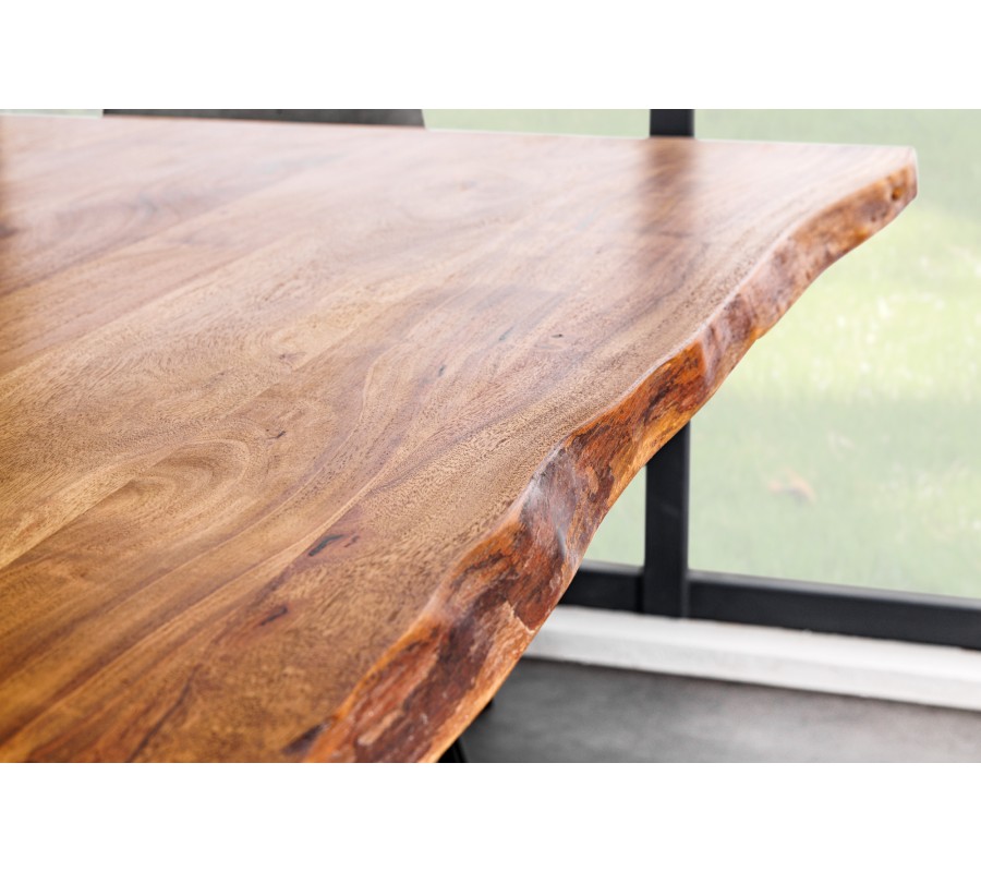 Vrchná doska je zhotovená z akáciového dreva v svetlej prírodnej hnedej farbe. Tento materiál je veľmi pevný a nábytok z neho je trvácny a dobre odoláva vplyvom každodenného používania. Každému kusu dodáva jedinečnosť tvar vrchnej dosky. Jej dlhšie hrany sledujú prirodzenú štruktúru dreva a ich atypický tvar zdôrazňuje prírodný charakter dizajnu.