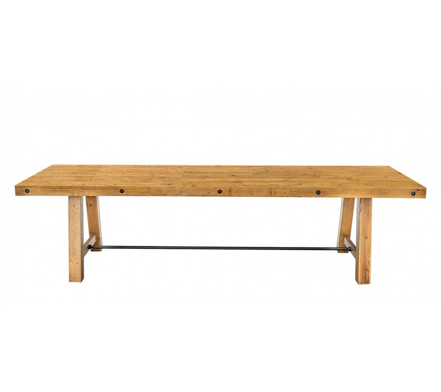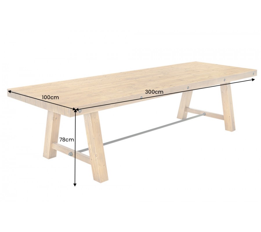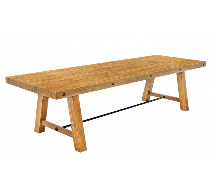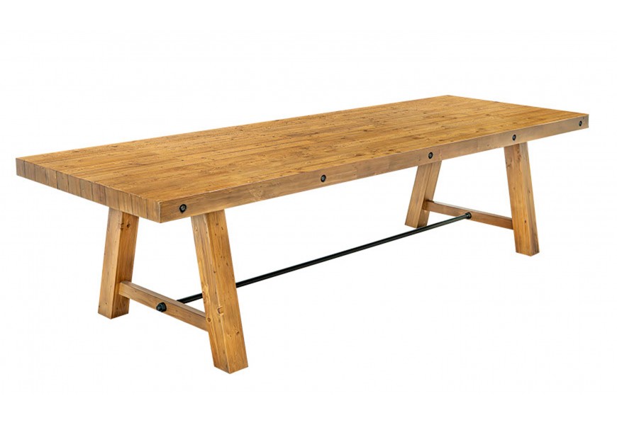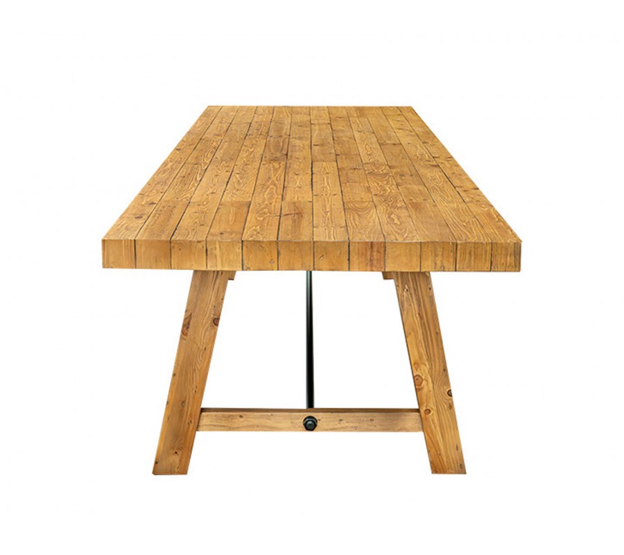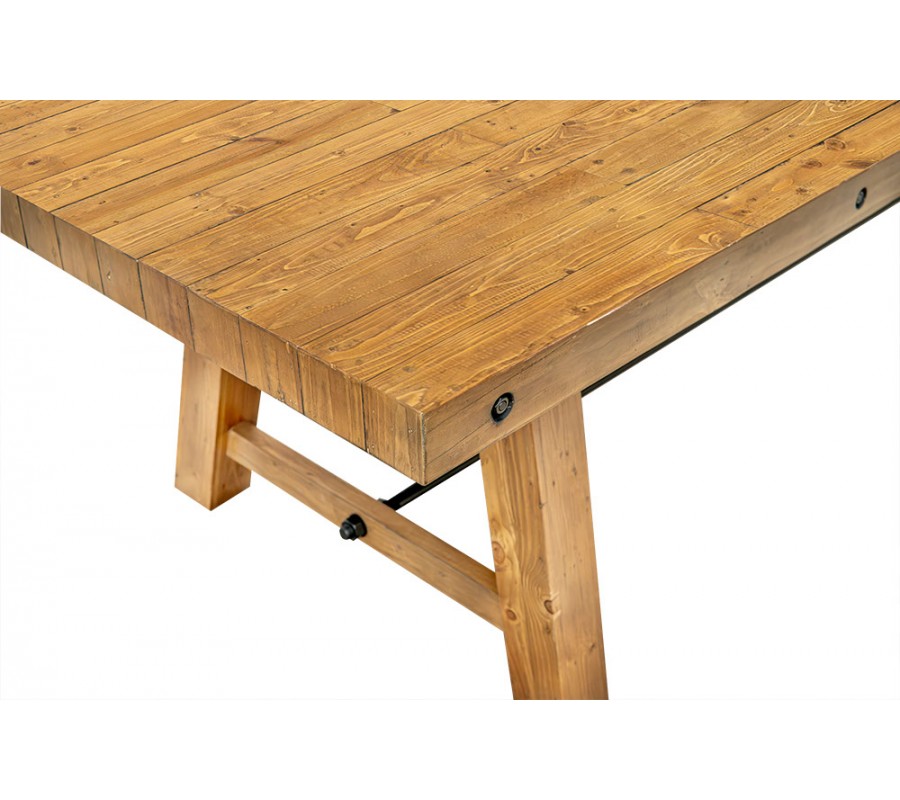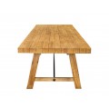 Vrchná doska je spojená piatimi kovovými tyčami, ktoré sú viditeľné na dlhšej strane stola. Z rovnakého materiálu je zhotovená aj dlhá kovová spojnica nožičiek, plynúca popod stred vrchnej dosky. Tieto prvky prinášajú do dizajnu jemný industriálny nádych, ktorý výborne korešponduje s organickým vizuálom dreva. Jednotlivé trámy nie sú identické, čo podčiarkuje autentickosť industriálnej estetiky a zaručuje originalitu stola. Nožičky stola sú hranaté a pôsobia mohutným dojmom. Sú mierne zošikmené a pozdĺž kratšej strany stola je každá dvojica prepojená drevenou spojnicou.