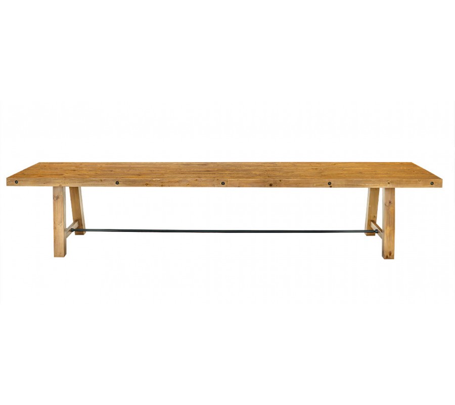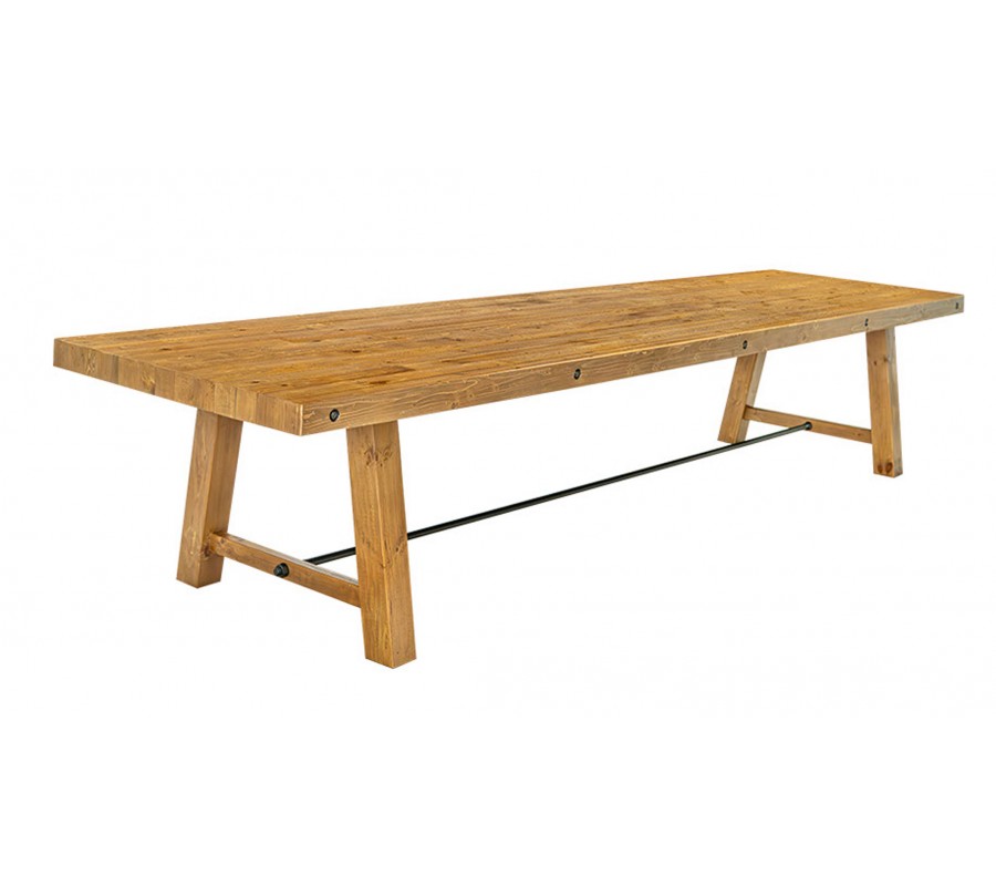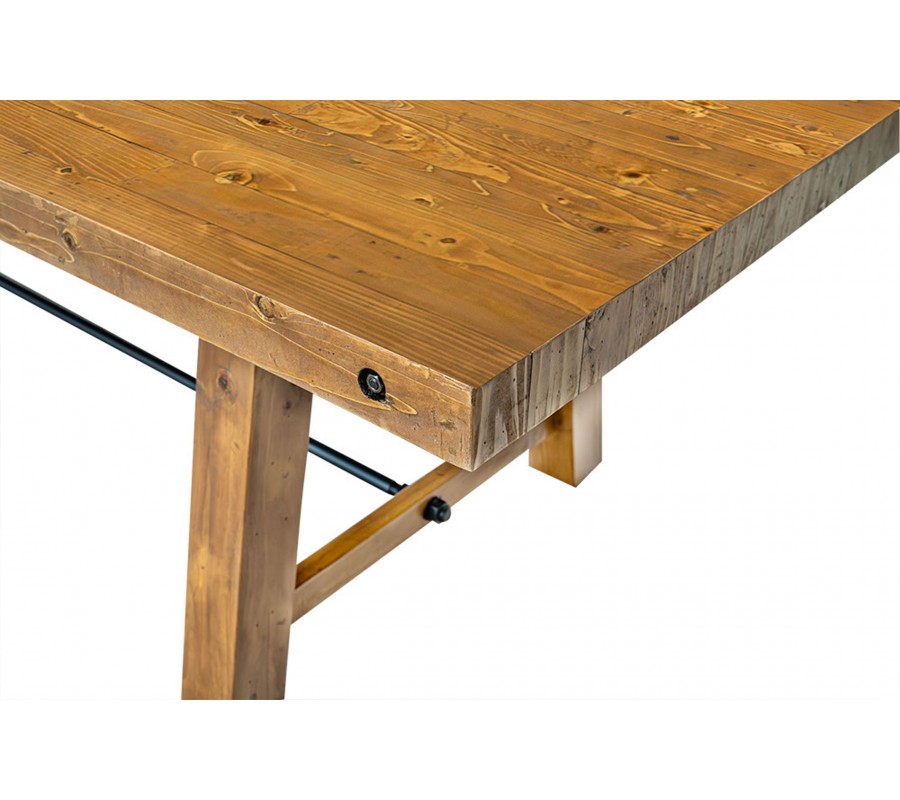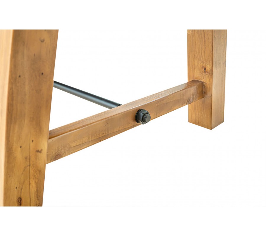 Na kratších stranách sa nachádza dvojica nožičiek, prepojených drevenou spojnicou. Hrubé nožičky sú hranaté a prispievajú k celkovému mohutnému vzhľadu stola. V spodnej časti sa po dĺžke stola tiahne čierna kovová spojnica, ktorá zaručuje výbornú stabilitu nábytku a zároveň prináša do dizajnu jemný industriálny nádych.