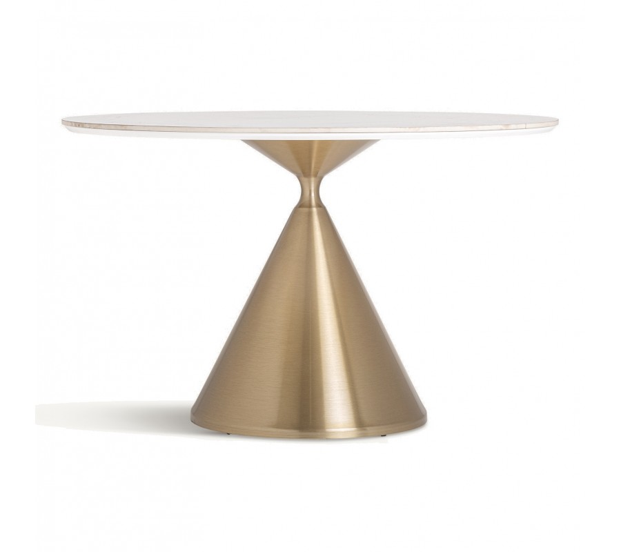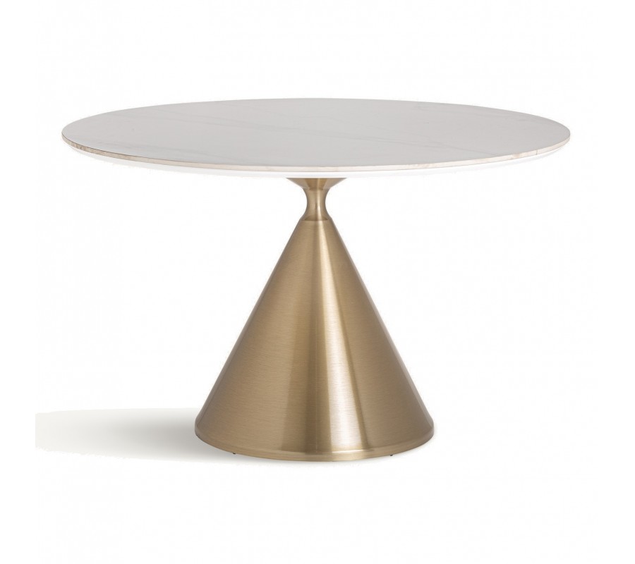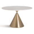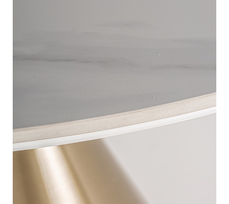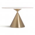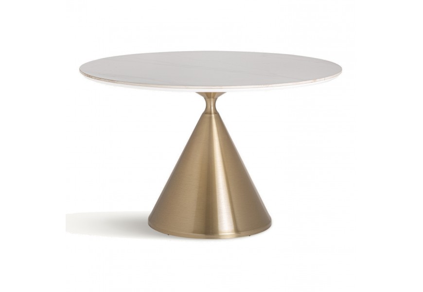 Luxusný art deco biely okrúhly jedálenský stôl Cronos s kamennou vrchnou doskou a zlatou nohou 120 cm