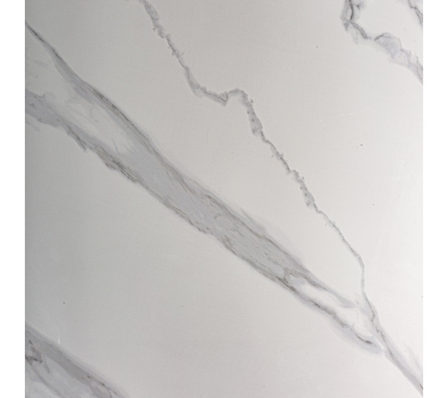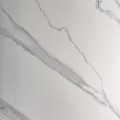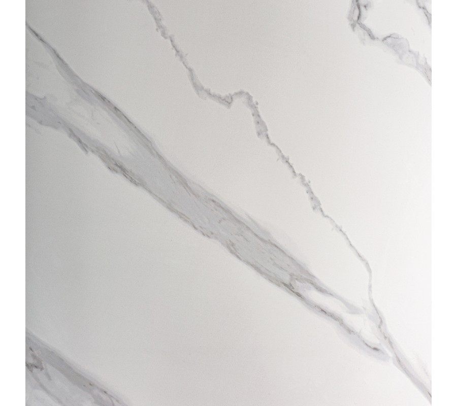 Vrchná doska má jednoduchý, kruhový tvar a je vyrobená zo sintrovaného kameňa. Ide o materiál, ktorý vzniká spájaním prírodných minerálov pomocou tepla. Vzniká tak kompaktný a mimoriadne odolný povrch. Biela farba je popretkávaná jemnou sivou kresbou, čím vzniká exkluzívny mramorový vzhľad.