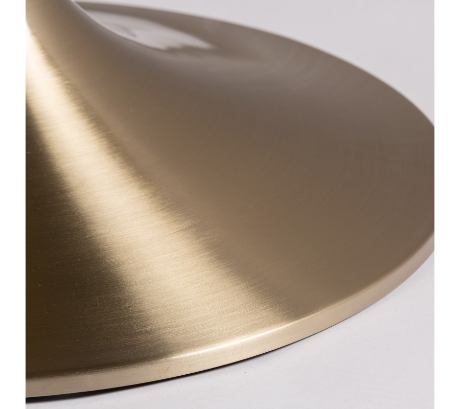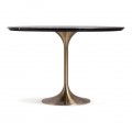 S tvarom vrchnej dosky korešponduje aj štíhla valcovitá noha stola, plynule prechádzajúca do okrúhlej podstavy, zaručujúcej skvelú stabilitu nábytku. Je vyrobená z kovu v zlatej farbe, ktorá dodáva do dizajnu lesk a zdôrazňuje opulentný art deco charakter. Môžete k nej doplniť stoličky so zlatými kovovými nožičkami a zamatovým alebo buklé čalúnením. Okolo stola usadíte štyri osoby.