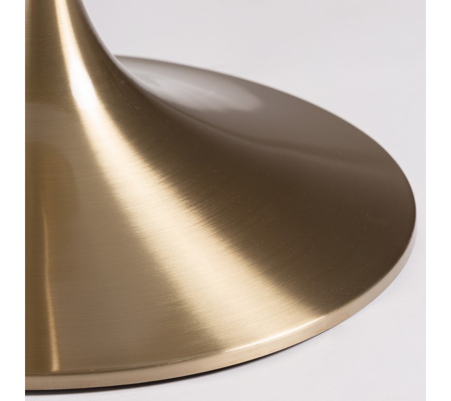 Noha stola má elegantný štíhly tvar a plynule prechádza do rozšírenej kruhovej podstavy, ktorá zaručuje skvelú stabilitu nábytku. Zároveň je praktickým riešením pre menšie jedálenské stoly, keďže maximalizuje využitie priestoru pod stolom. Je vyrobená z kovu s lesklým zlatým povrchom, ktorý podčiarkuje luxusný charakter mramorovej dosky.