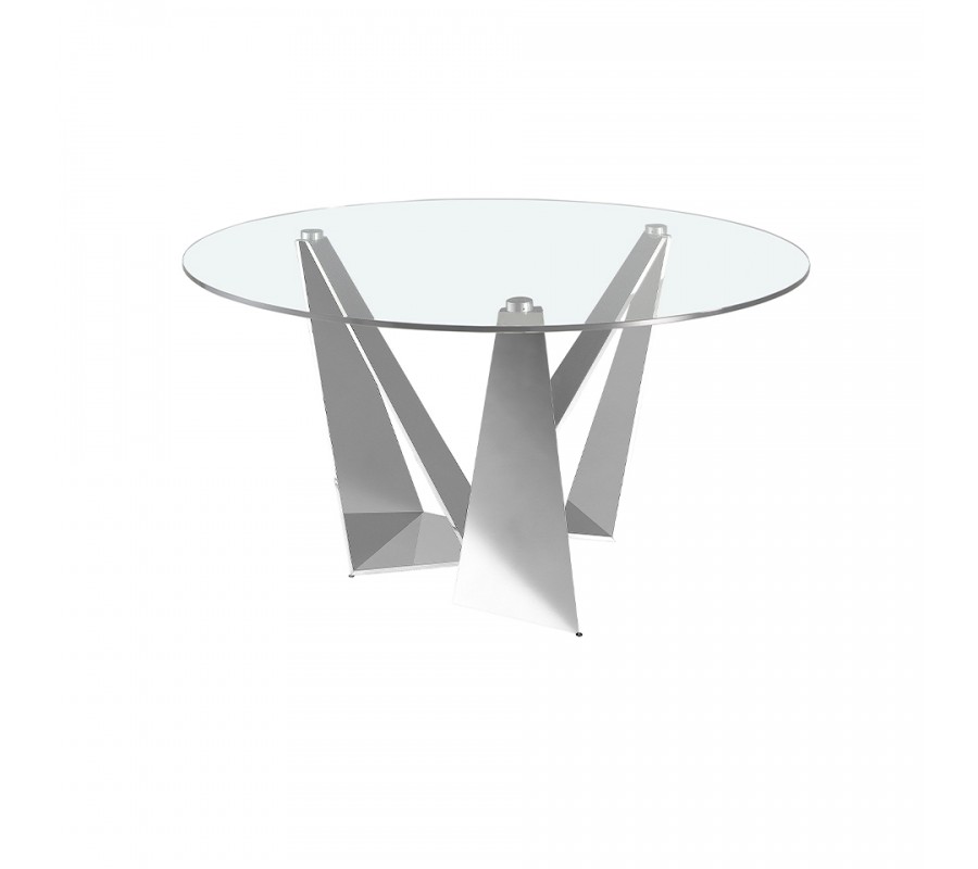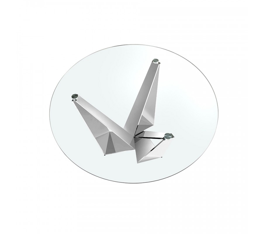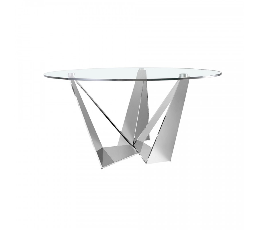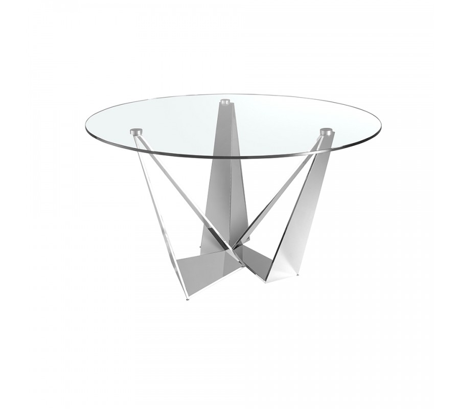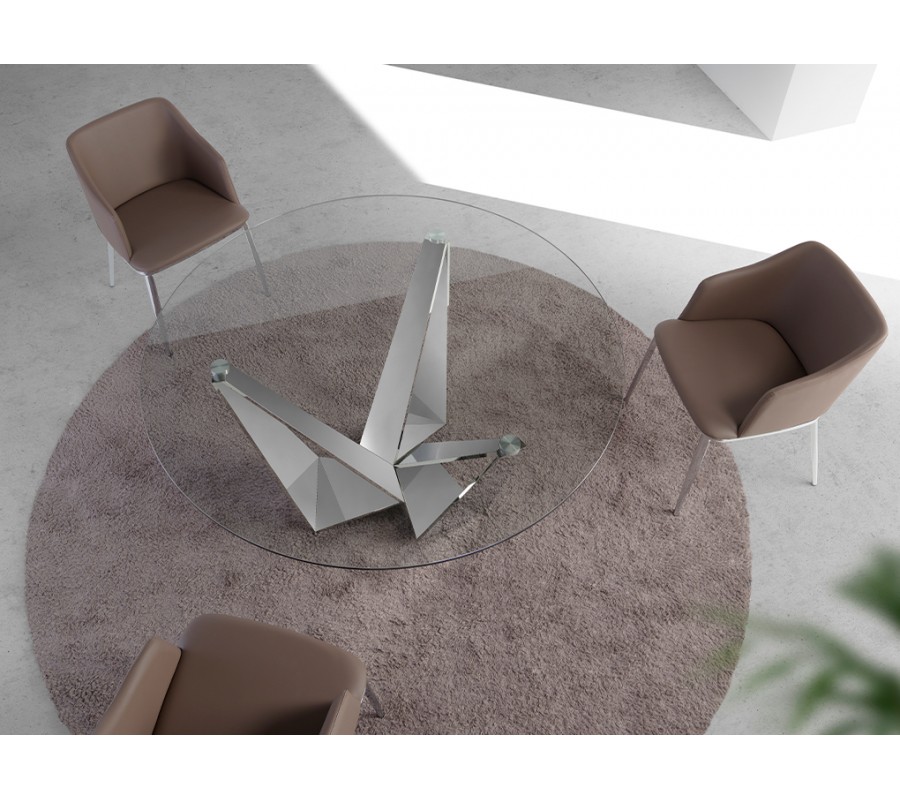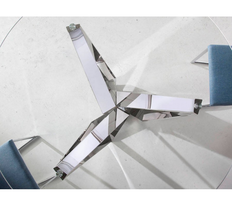 Podstava je vyrobená z nehrdzavejúcej ocele s lesklou chrómovou povrchovou úpravou. Jej zrkadlový povrch výborne dopĺňa sklo, odráža svetlo, a stôl tak pôsobí ľahkým a vzdušným dojmom, ktorý priestor vizuálne nezaťaží.