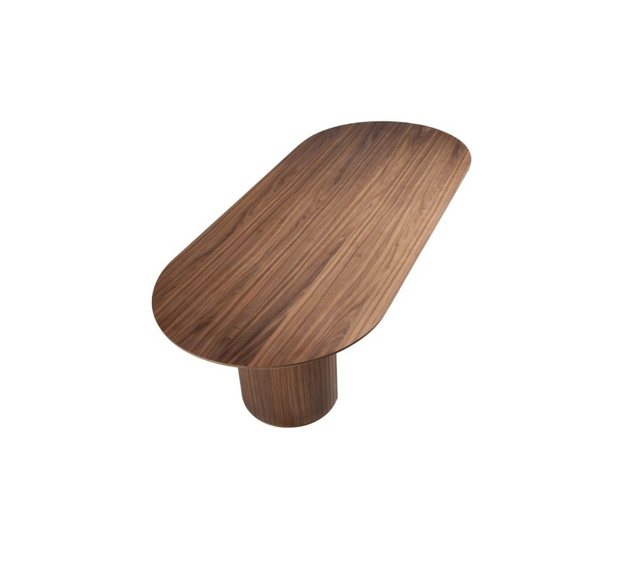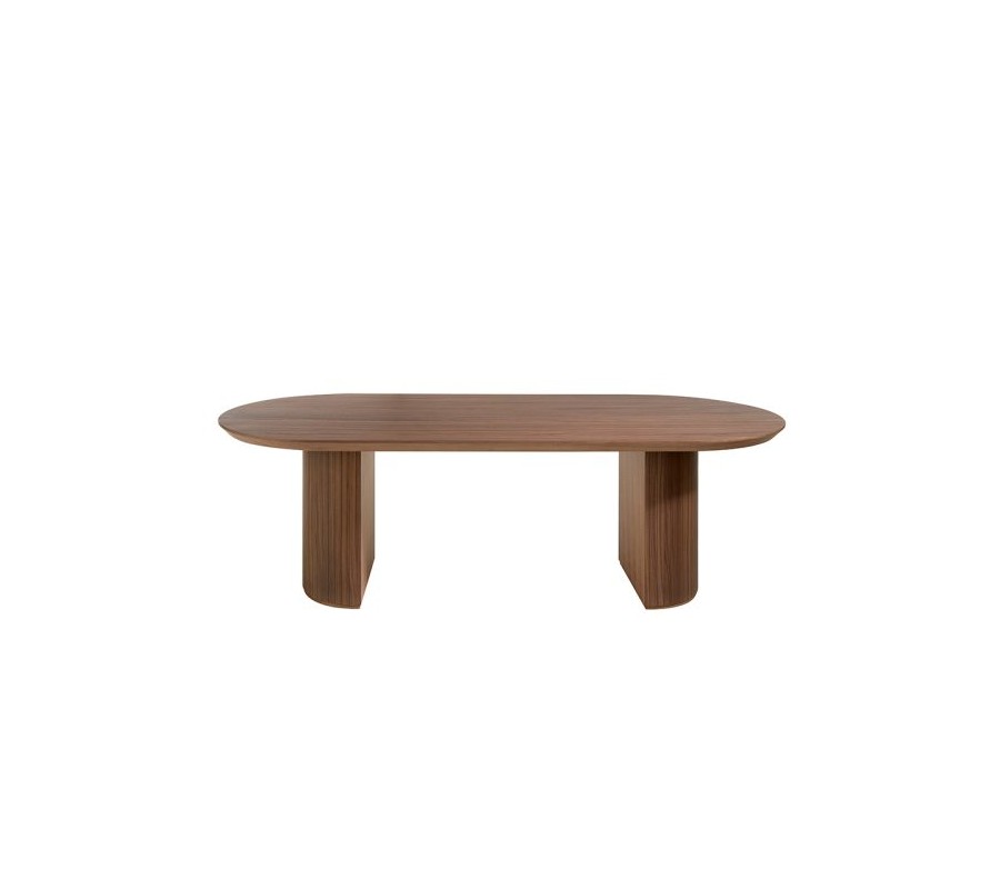 Stôl má minimalistickú siluetu, v ktorej dominujú pôvabné krivky a hladké povrchy. Vrchná doska má predĺžený oválny tvar so šikmo zrezanou bočnou hranou. Výbornú stabilitu zaručujú nábytku dve mohutné nohy. Majú polkruhový pôdorys, so zakrivenou časťou umiestnenou paralelne s oblúkmi vrchnej dosky. Dizajn tak pôsobí sofistikovaným ucelený dojmom a do jedálne prinesie elegantný prvok.