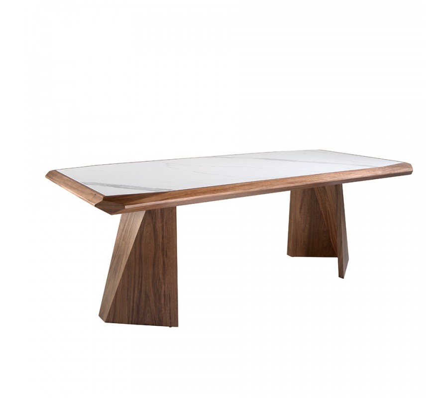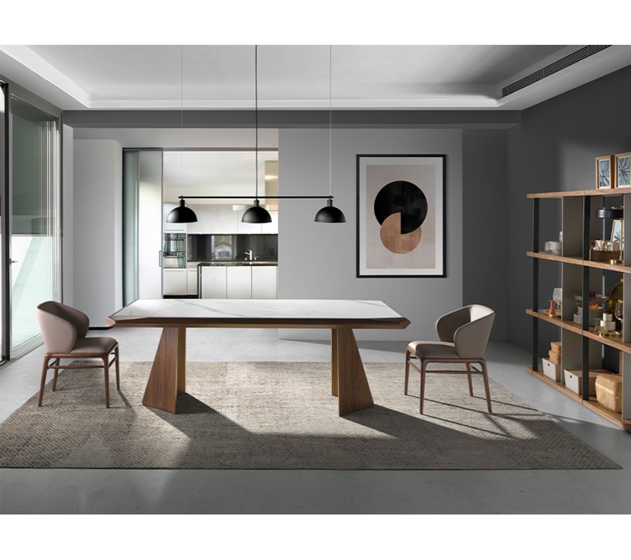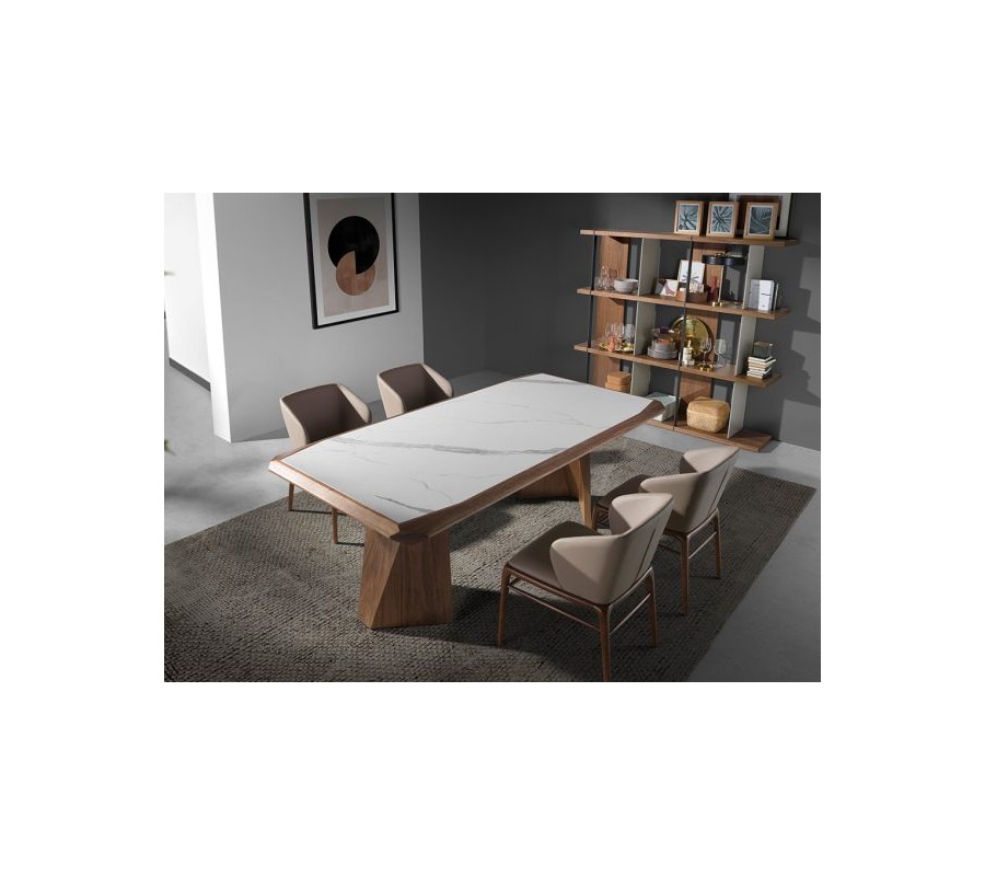 Jedálenský stôl Forma Moderna vás očarí svojou avantgardnou siluetou. Súčasný taliansky dizajn spája drevo a mramor v sofistikovanej vizuálnej symfónii a elegantná farebná paleta robí z tohto funkčného nábytku hlavného protagonistu modernej jedálne. Stôl posykytne miesto pre 8 osôb.