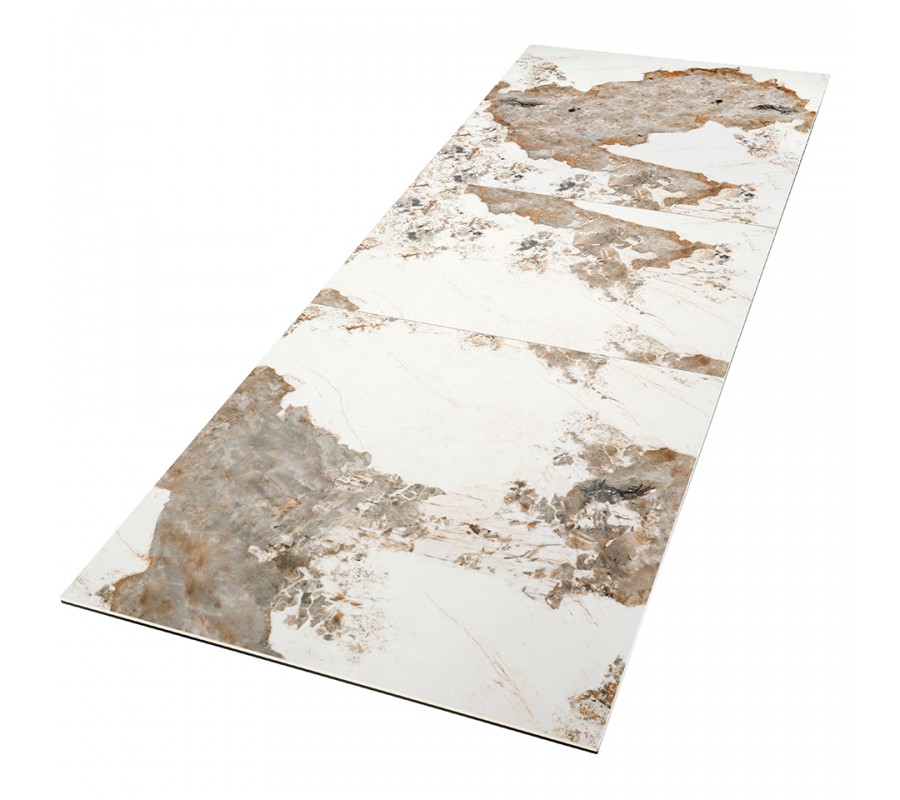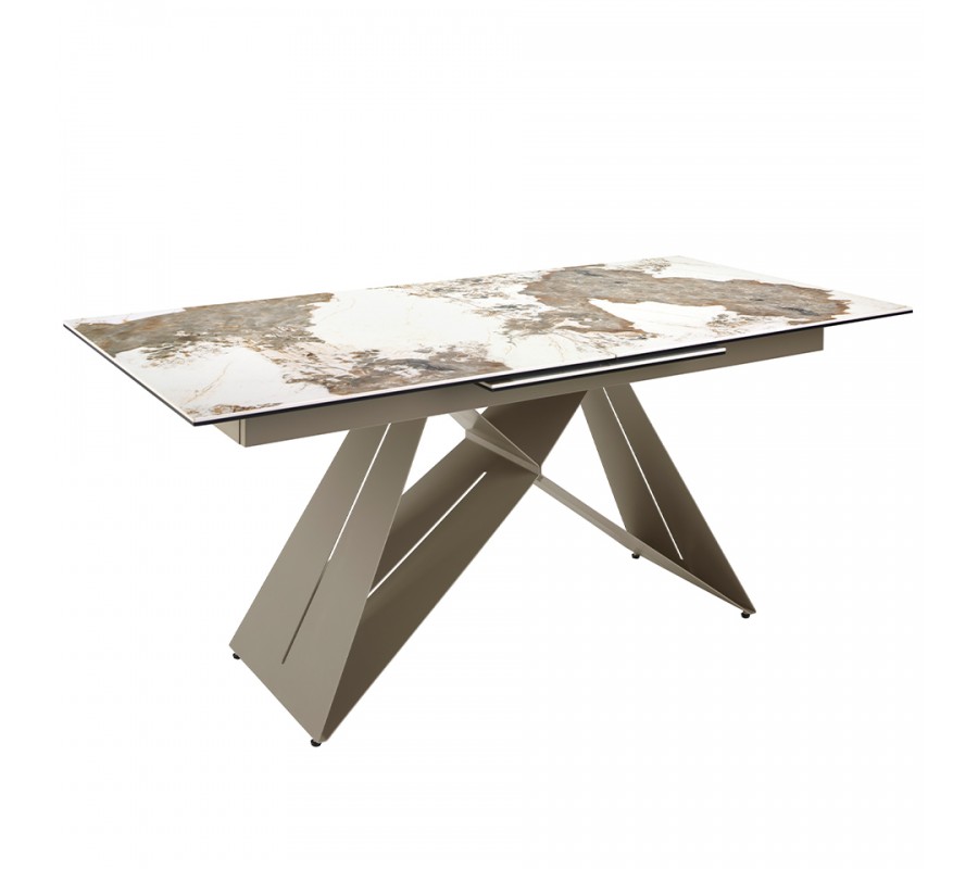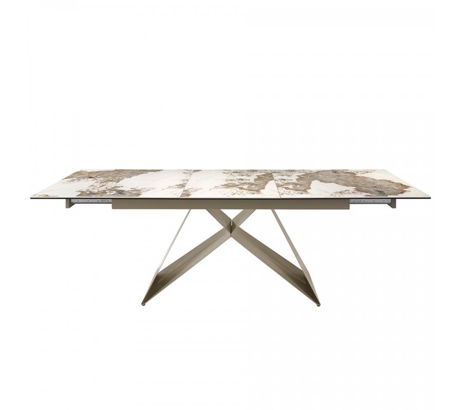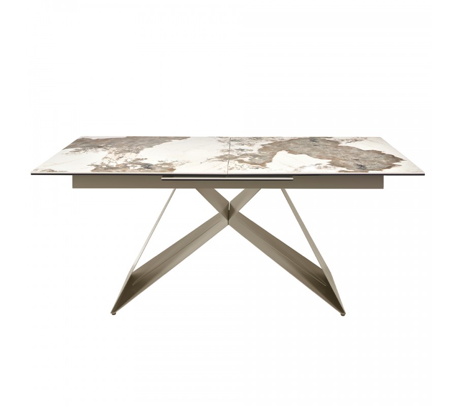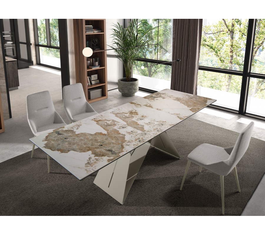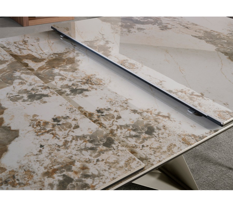 Vrchná doska má jednoduchá obdĺžnikový tvar s dĺžkou 180 cm a možnosťou rozloženia na 240 cm. Stôl vám tak poskytne miesto pre až 10 osôb. Vrchná doska je vyrobená z porcelánu, ktorý zaručuje odolný a na údržbu nenáročný povrch. Zdobí ju luxusný dizajn mramoru s mliečnym bielym pozadím a naturálnou kresbou v zemitých odtieňoch hnedej a sivej.