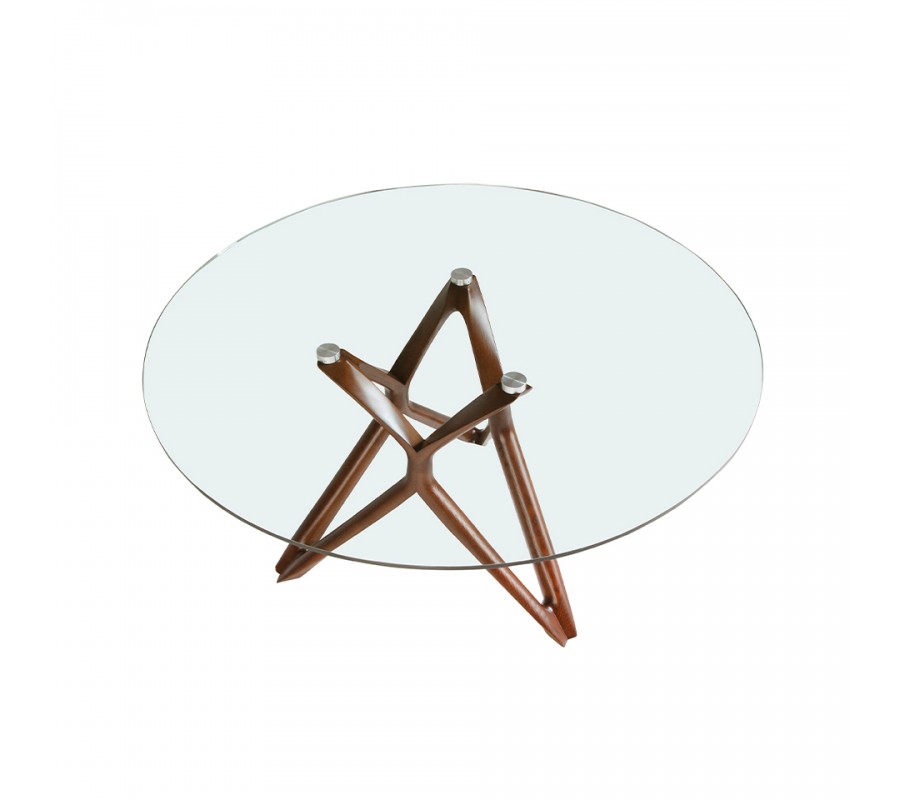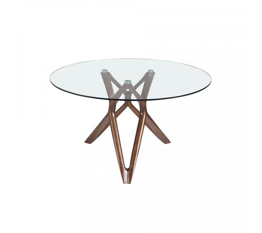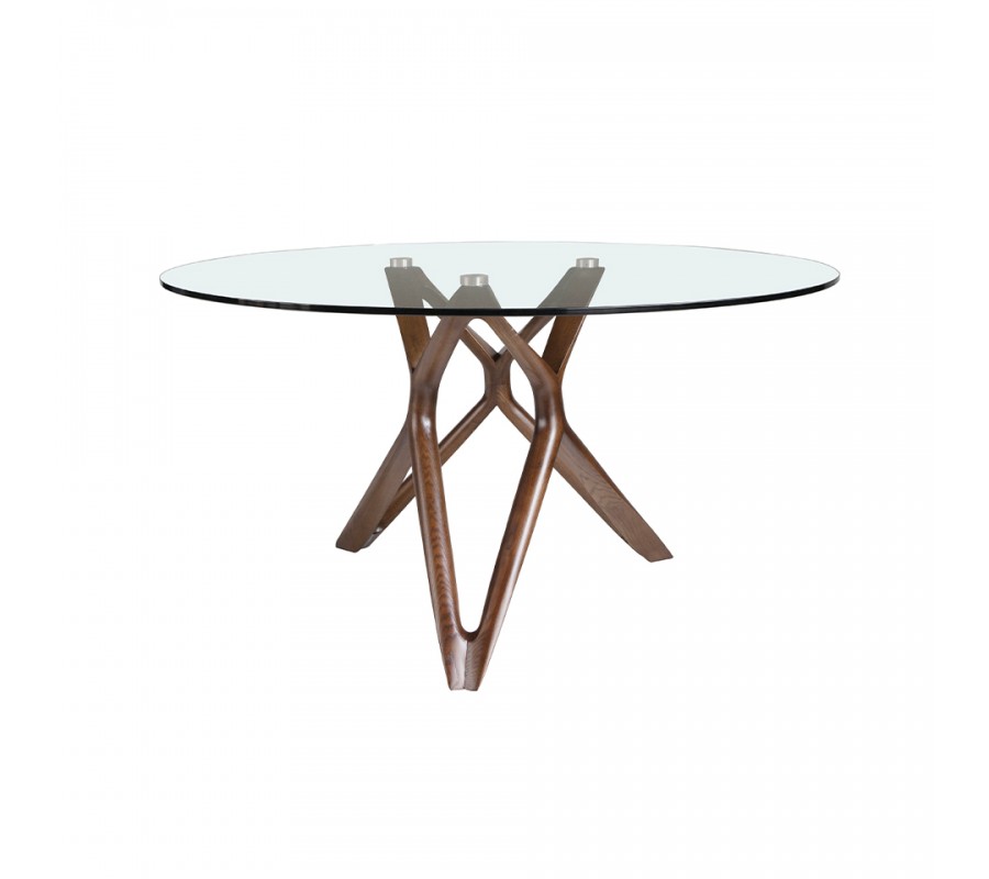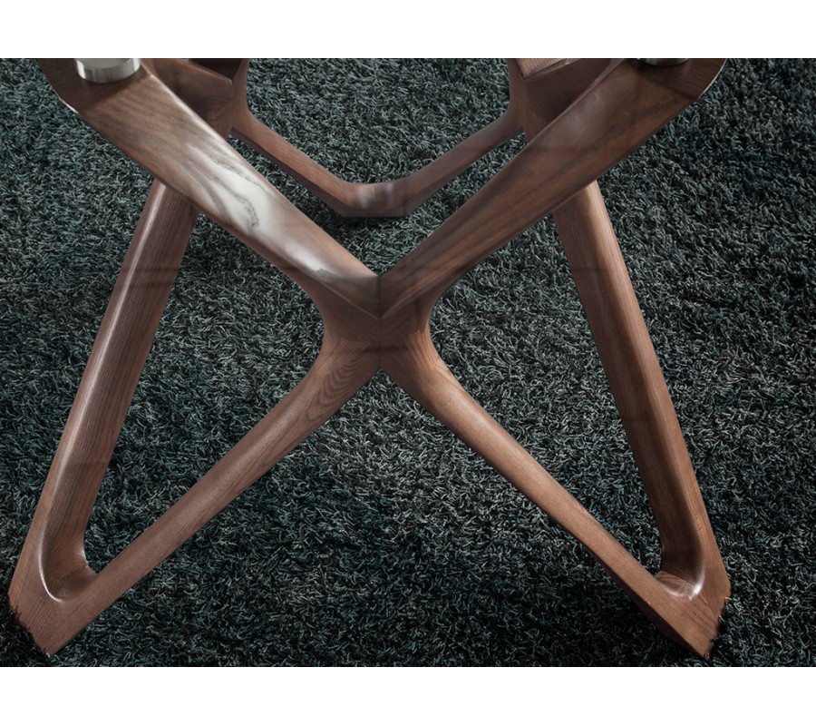 Dizajnu dominuje originálna podstava, vyrobená z masívneho jaseňového dreva. Tvoria ju tri nohy, z ktorých každá má zalomenú kosoštvorcovú siluetu. Na bokoch sú prepojené, čo vytvára celistvý dynamický vizuál. Rovné línie a zjemnené zaoblené uhly dodávajú siluete stola elegantný vzhľad.