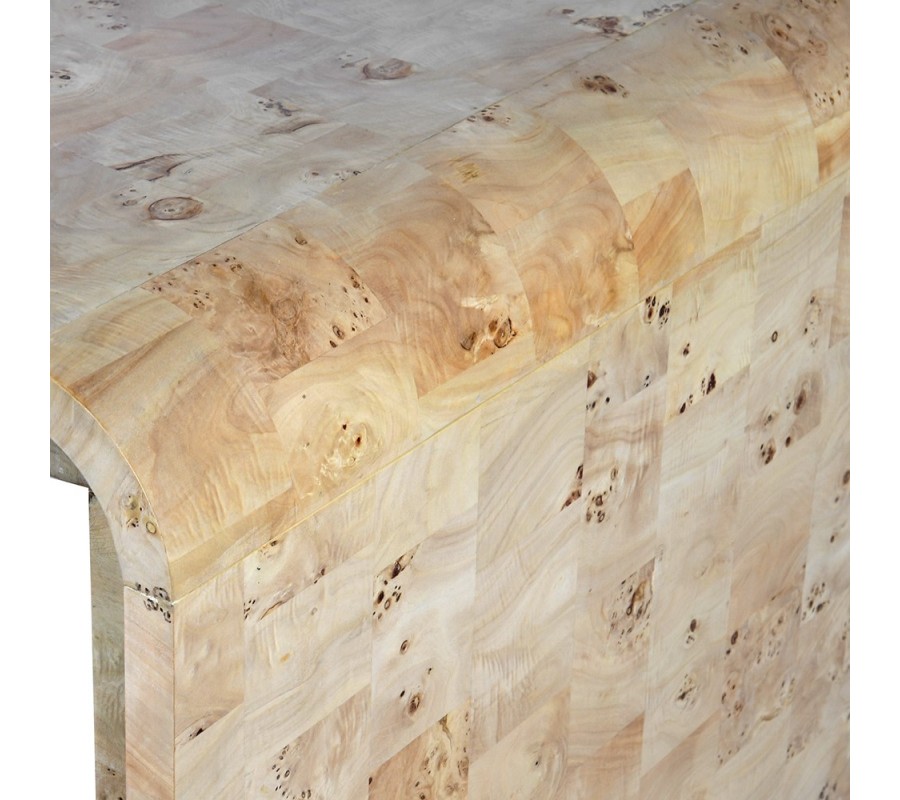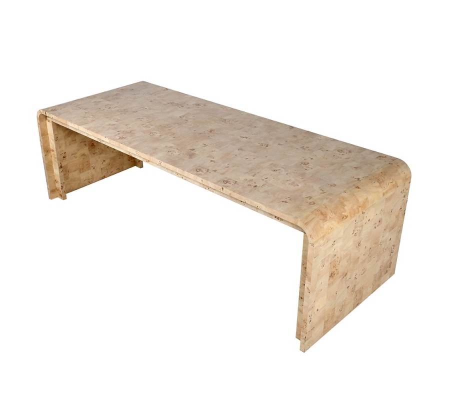 Stôl je vyrobený z dyhy z burl dreva, ktoré má jedinečný vzhľad a pôvod. Nepochádza z konkrétneho stromu, ale charakterizuje ho spôsob rastu. Ide o drevo z nevypučaných výhonkov, ktoré sa manifestujú ako hrče na stromoch. Drevo má asymetrickú štruktúru s atypickou kresbou letokruhov a tiež je tvrdšie a koncentrovanejšie. Dizajn naplno využíva vizuálny potenciál materiálu. Dyhy tvoria geometrickú skladu s originálnou kresbou na každej jednej časti.