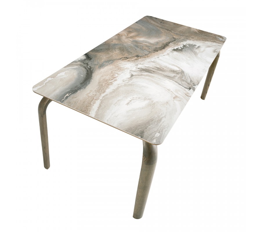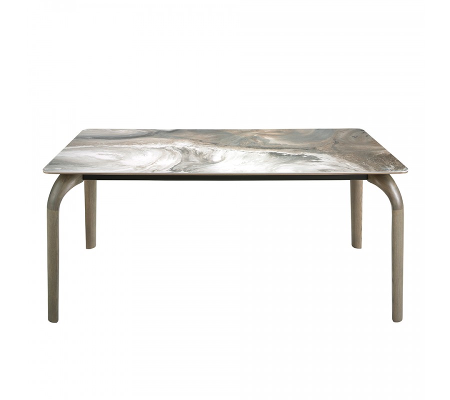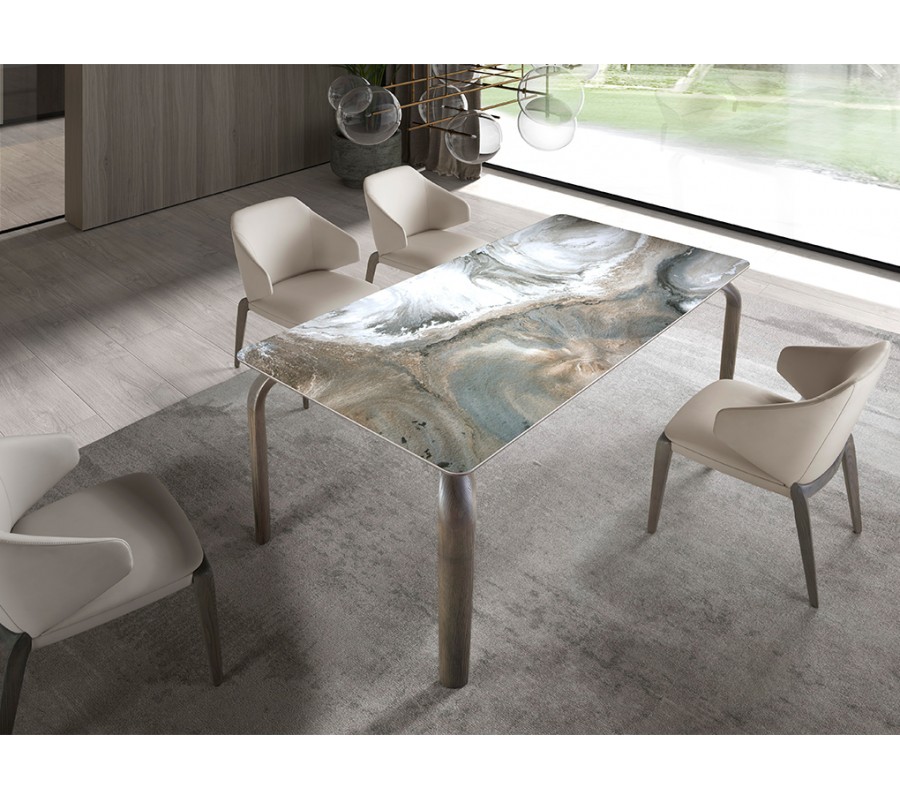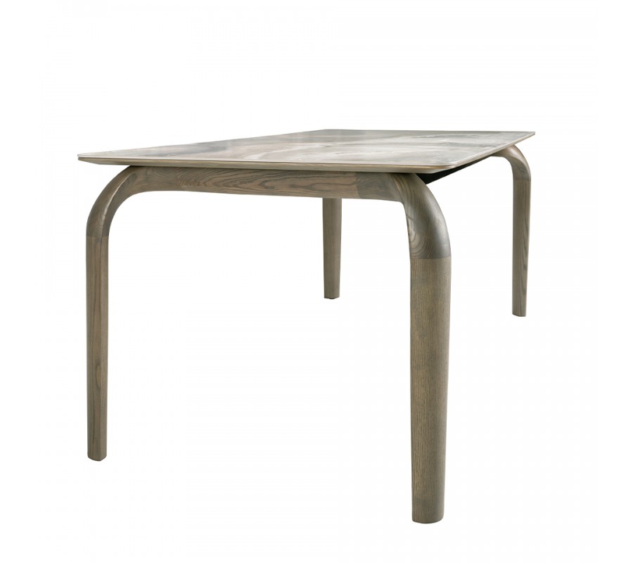 Jedálenský stôl má obdĺžnikovú vrchnú dosku so zaoblenými rohmi. Jej zjemnený tvar výborne korešponduje s dramatickou siluetou podstavy. Nožičky sú štíhle a valcovité, s výrazným zakrivením vo vrchnej časti. Moderný minimalistický charakter nábytku zdôrazňujú aj hladké povrchy, na ktorých vynikajú naturálne vzory.