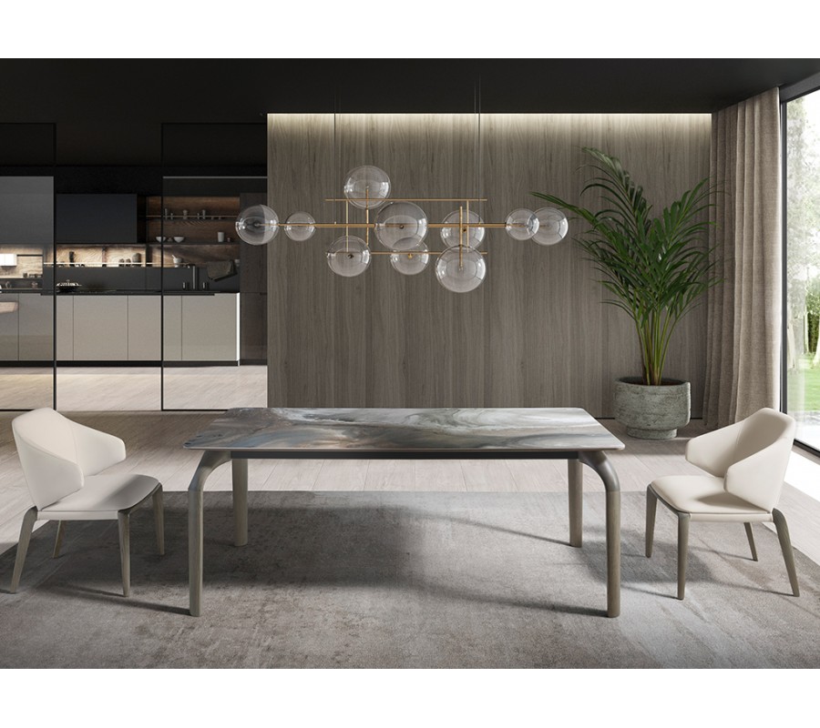Jedálenský stôl Carrie prinesie do vášho domova modernú eleganciu. Súčasný taliansky dizajn spája minimalistické tvary so sofistikovanou paletou sivých odtieňov a mramorový dizajn dodáva nábytku luxusný vizuál.
