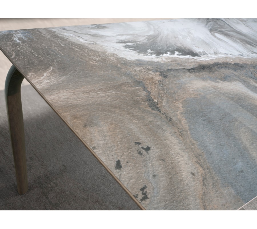 Vrchná doska je vyrobená z porcelánu a poskytuje vám pevný a na údržbu nenáročný povrch. Zdobí ju podmanivý dizajn mramoru s dramatickou kresbou v zemitých sivých a hnedých odtieňoch. Kombinácia lesklého porcelánu a mramorového vizuálu podčiarkuje luxusný charakter nábytku.