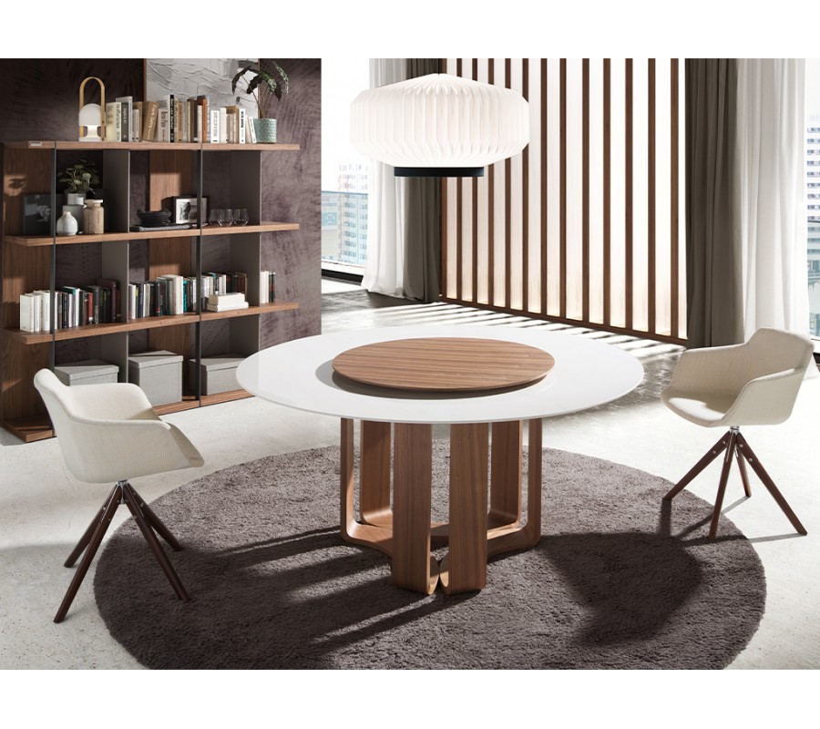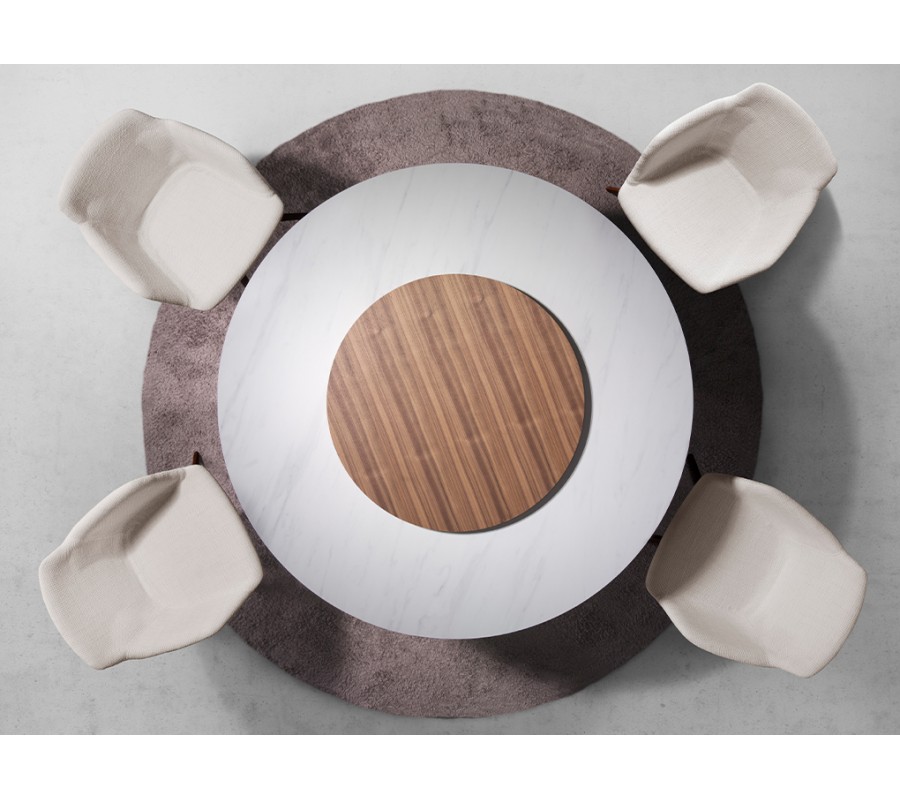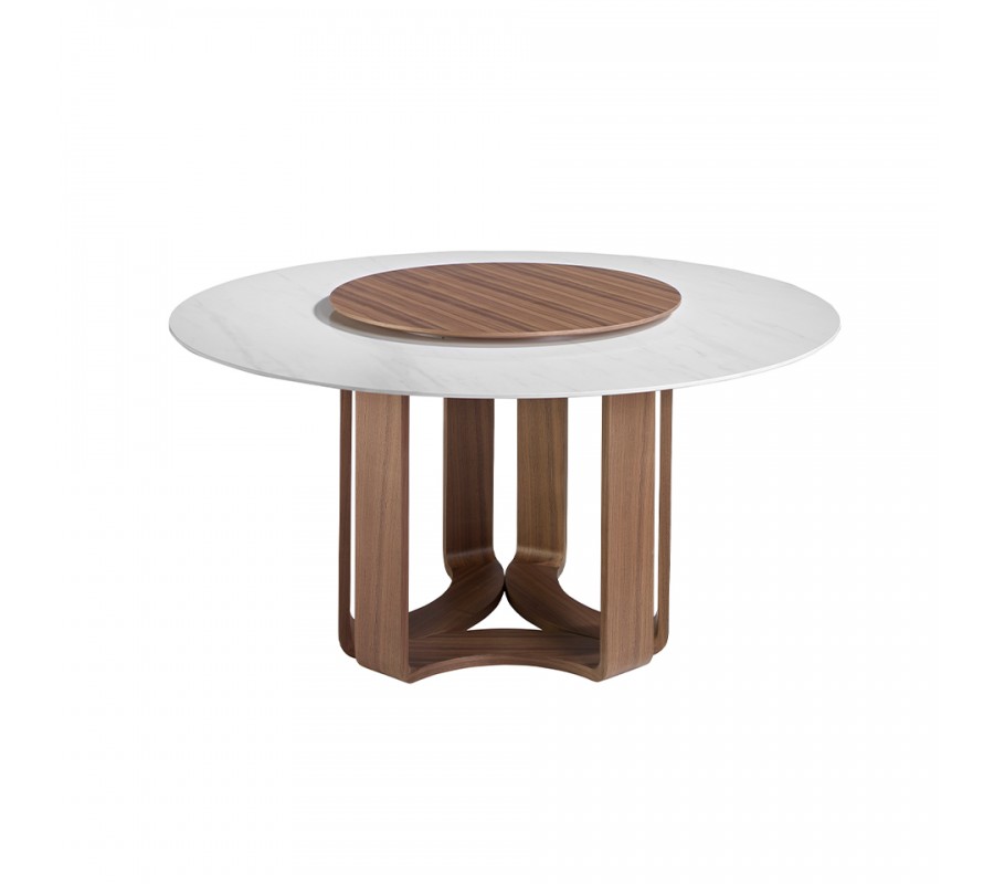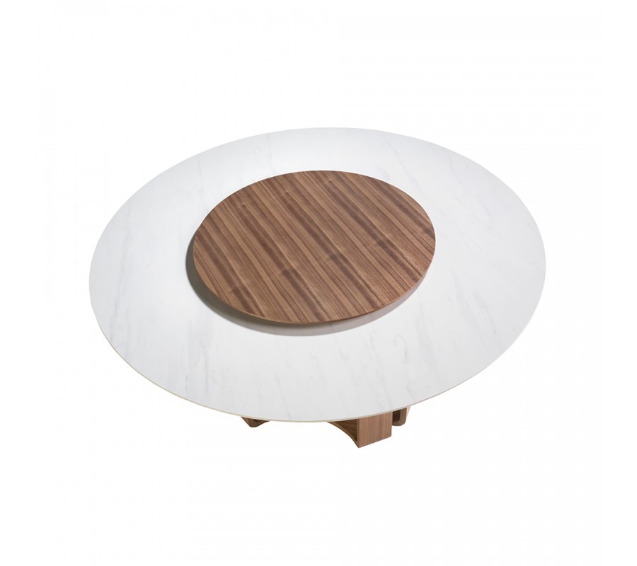 Jedálenský stôl je ideálnou kombináciou krásy a funkčnosti. Vrchná doska je vyrobená z porcelánu, ktorý vám poskytuje pevný a ľahko udržiavateľný povrch. Má elegantný dizajn bieleho mramoru so subtílnym sivým žilovaním. Na vrchnej doske je umiestnený okrúhly otočný drevený podnos, ktorý vám pomôže pri servírovaní. Je odnímateľný a rovnako ako podstava stola, vyrobený z orechového dyhovaného dreva.