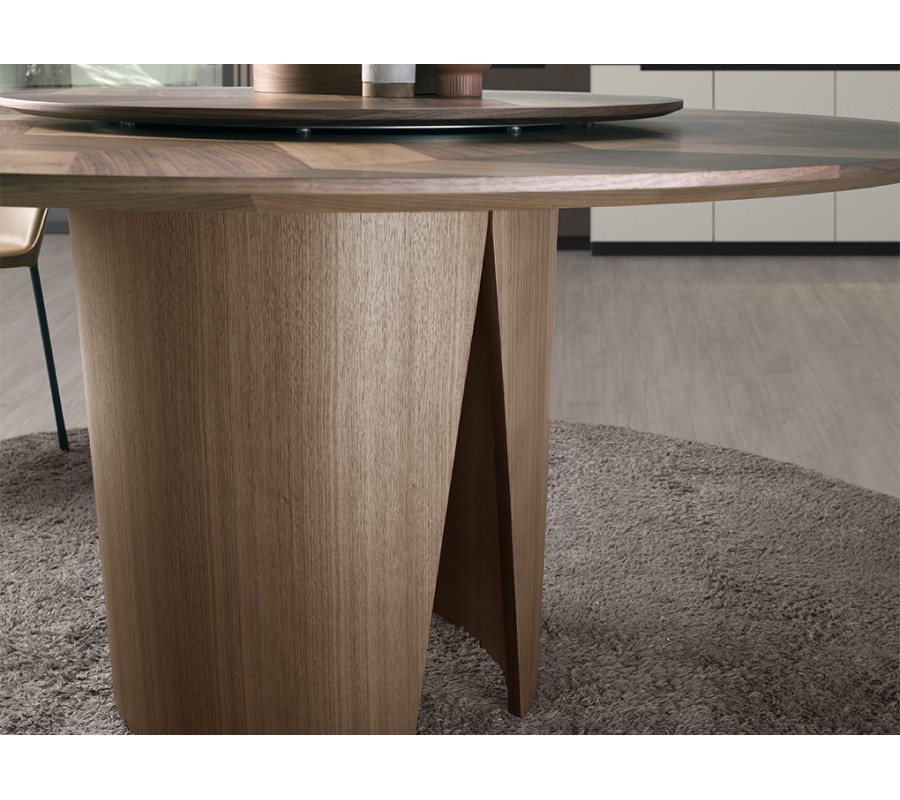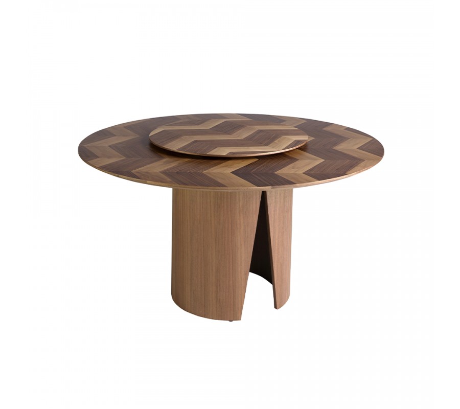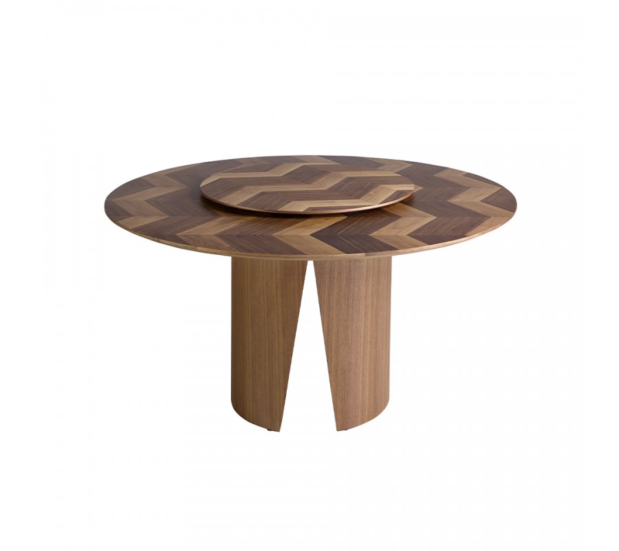 Jedálenský stôl má modernú siluetu, v ktorej dominujú elegantné krivky, v kontraste s lineárnymi dekoračnými prvkami. Vrchná doska je okrúhla a v jej strede sa nachádza tiež okrúhly vyvýšený podnos, ktorý je otočný a odnímateľný. Okrem praktickej funkcii pri servírovaní tak vytvára aj štýlový vrstvený dizajn. Noha stolíka má jednoduchý valcovitý tvar, ktorý zdobia dva oproti sebe umiestnené výrezy v tvare vysokého štíhleho trojuholníka. Tie sa vizuálne prepájajú s chevronovým vzorom na vrchnej doske.