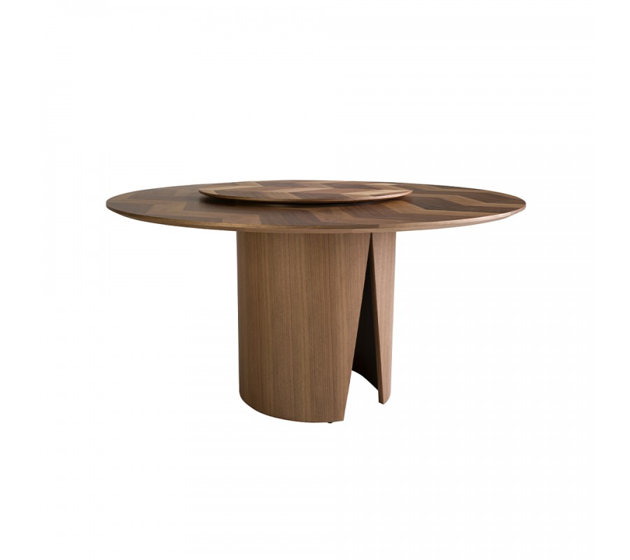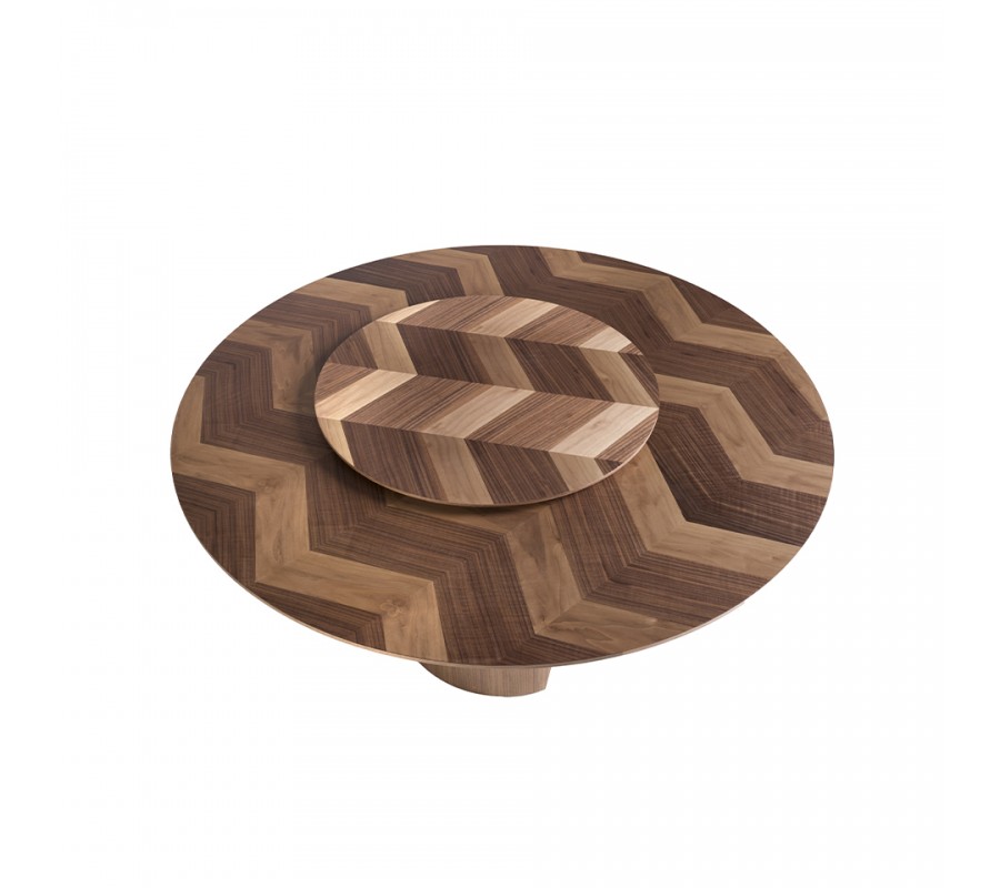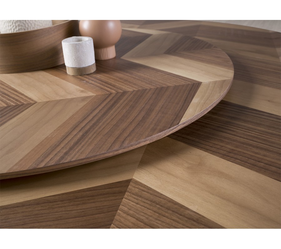 Luxusný hnedý okrúhly jedálenský stôl Vita Naturale s otočný stredovým podnosom a chevronovým vzorom na vrchnej doske 150 cm