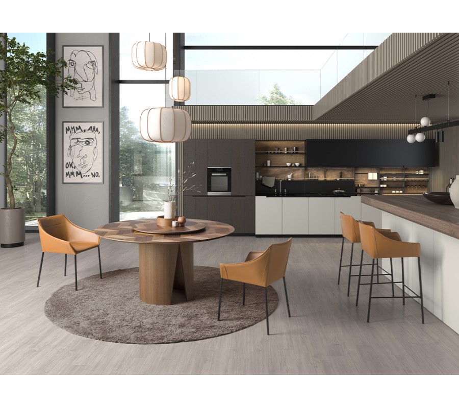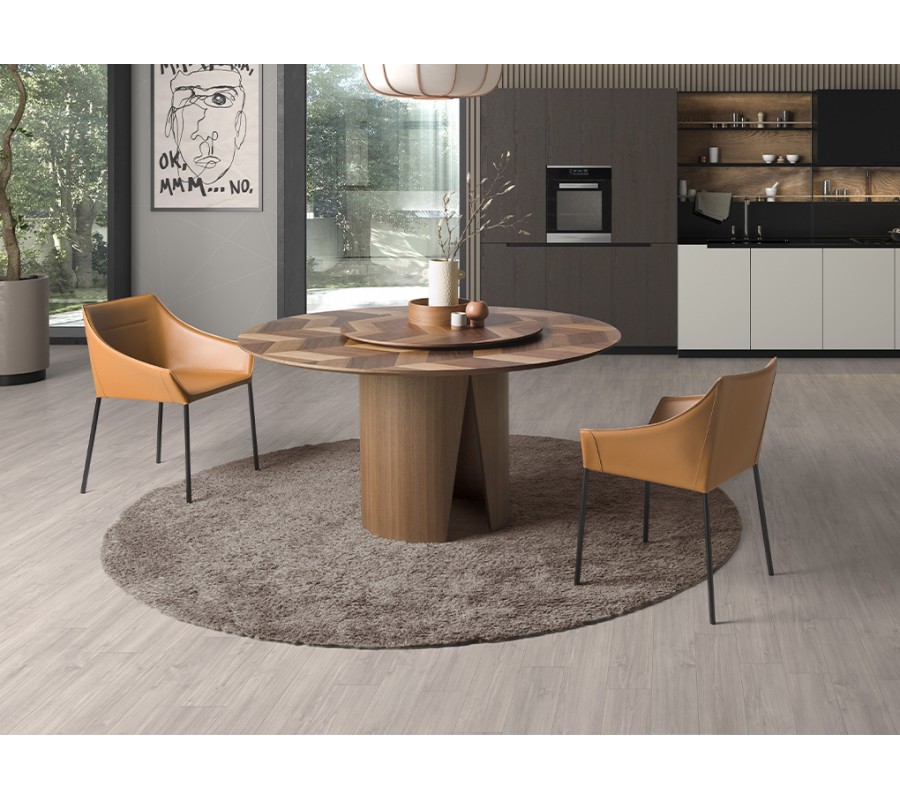 Jedálenský stôl Vita Naturale bude štýlovým stredobodom vašej jedálne, ktorý okamžite upúta pozornosť. Moderný taliansky dizajn naplno využíva krásu dreva a prinesie do priestoru nádych luxusnej elegancie. Paleta naturálnych hnedých odtieňov dodá miestnosti pocit tepla a vrchná doska s priemerom 150 cm poskytne stolovacie miesto pre šesť osôb.