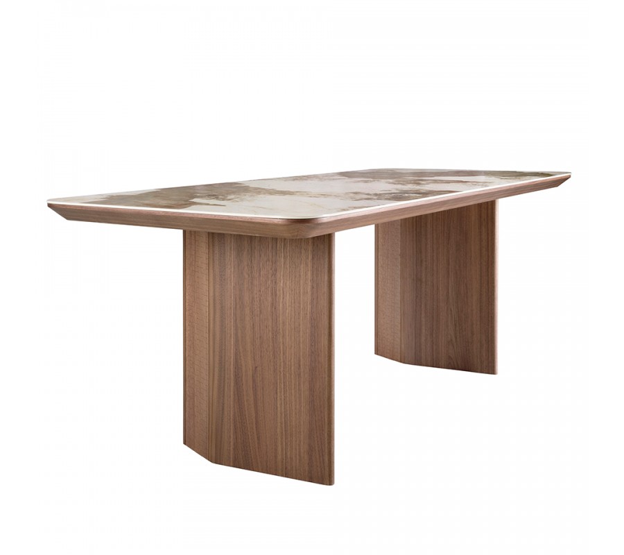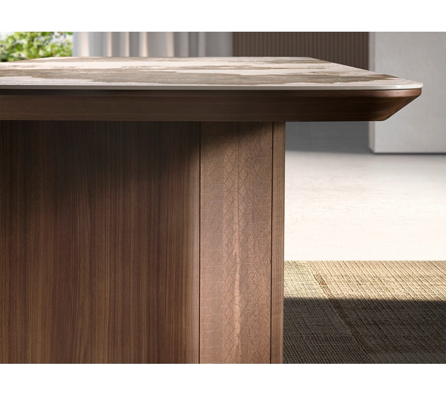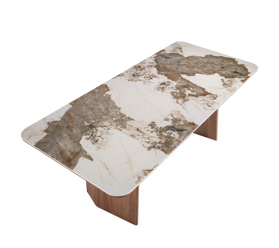 Stôl je vyrobený z kvalitnej pravej orechovej dyhy v prírodnej svetlej hnedej farbe. Jej povrch zdobí jemná kresba letokruhov, ktorá vytvára prirodzene pôsobiaci lineárny vzor. Drevo prinesie do priestoru pocit tepla a výborne korešponduje s naturálnym charakterom kresby kameňa na vrchnej doske.