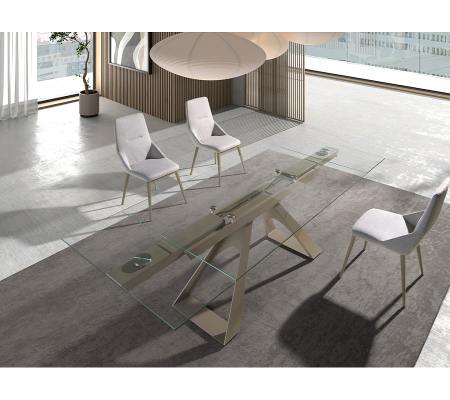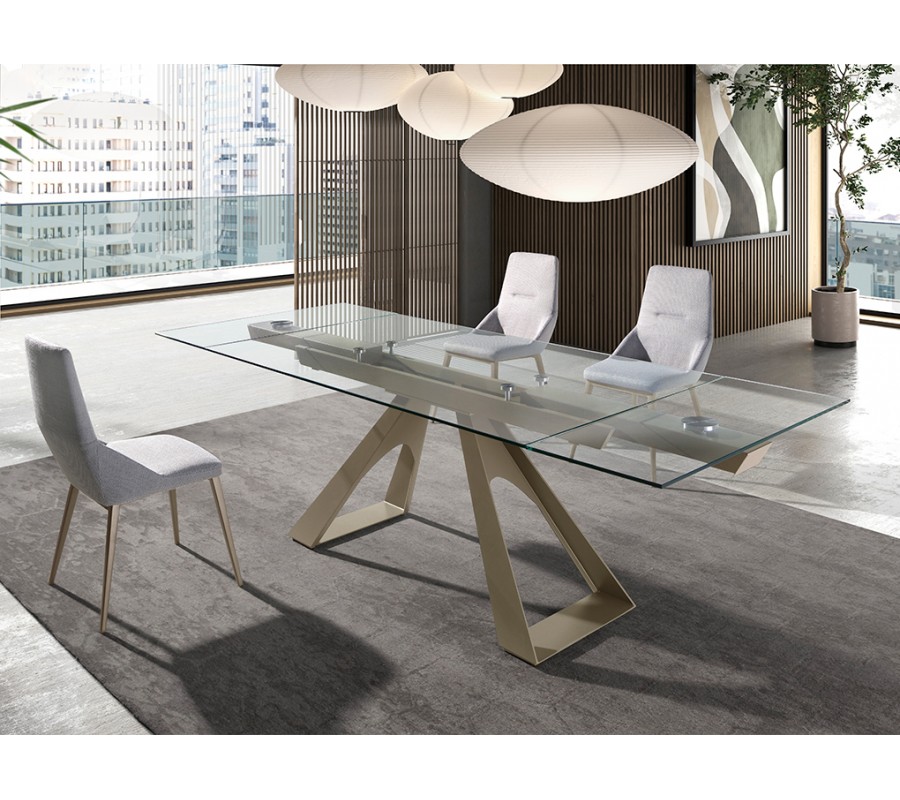 Jedálenský stôl Forma Moderna je spojením elegancie a moderného talianskeho dizajnu. Kombinácia skla a luxusnej svetlej zlatej farby pôsobí sofistikovaným dojmom a vytvorí vizuálne podmanivý stredobod miestnosti. Vrchná doska je rozkladacia a poskytne vám stolovacie miesto pre až 10 osôb.