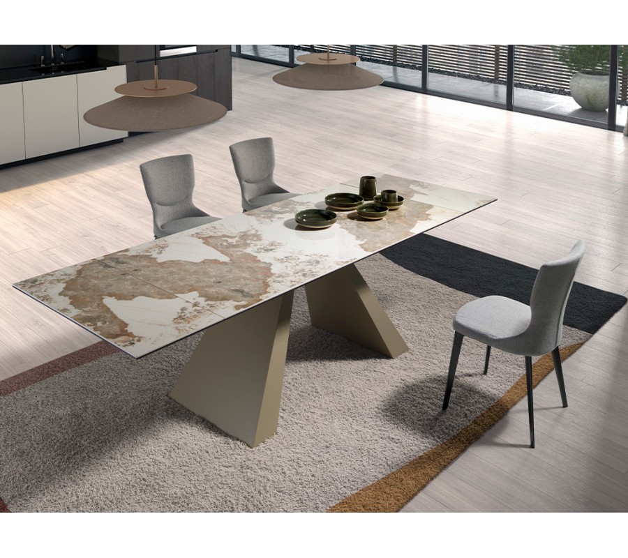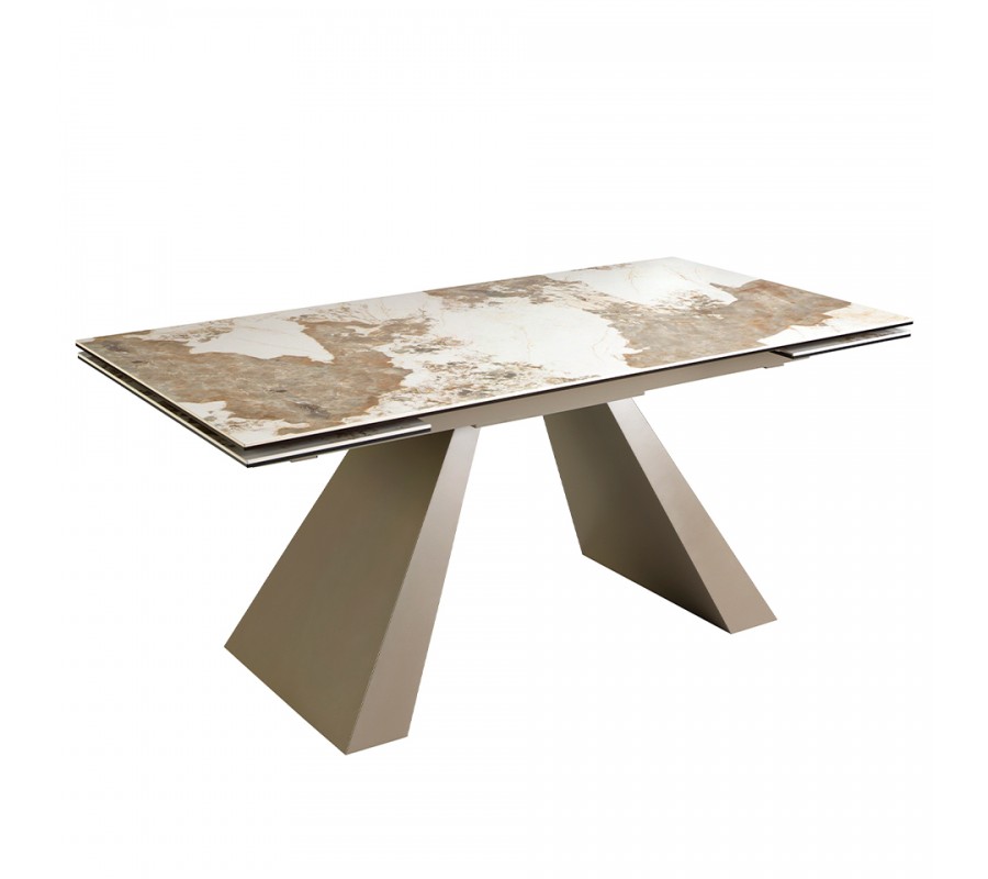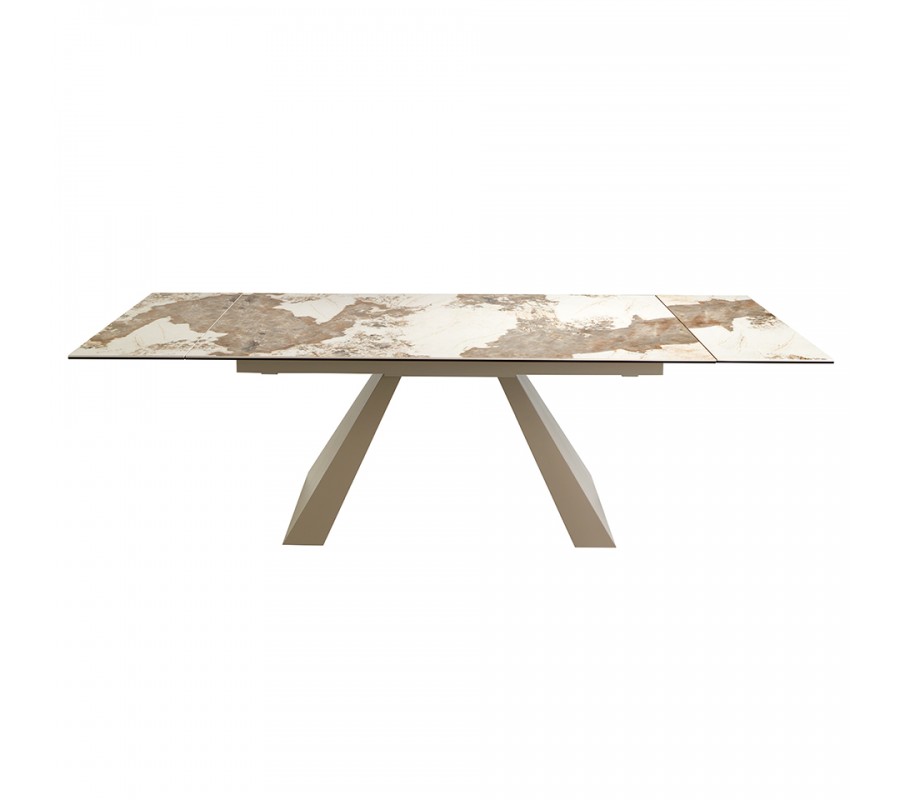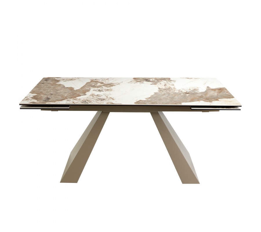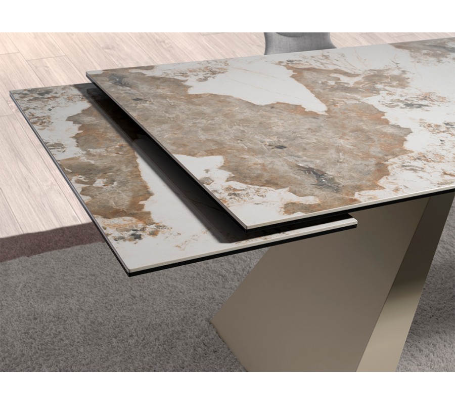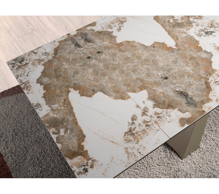 Vrchná doska je vyrobená z porcelánu, ktorý vám zaručí pevný povrch s nenáročnou údržbou. Zdobí ju exkluzívny mramorový dizajn. Na bielom pozadí sa odvíja naturálna kresba kameňa s odtieňoch hnedej a béžovej, ktorá robí zo stola dominantný dekoračný prvok miestnosti.
