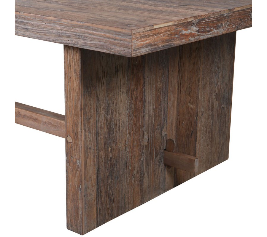 Pod vrchnou doskou sa nachádzajú dve nohy v obdĺžnikovom tvare uložené horizontálne na konci krajov stola. Nohy sú spojené spojovacou tyčou, ktorá zabezpečuje väčšiu stabilitu. Stôl pôsobí robustne, masívne a vďaka jeho tmavej farbe sa radí do rustikálneho štýlu.