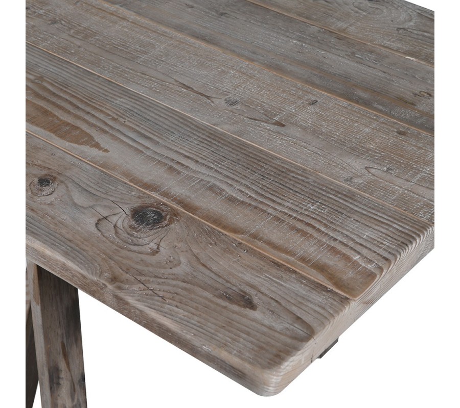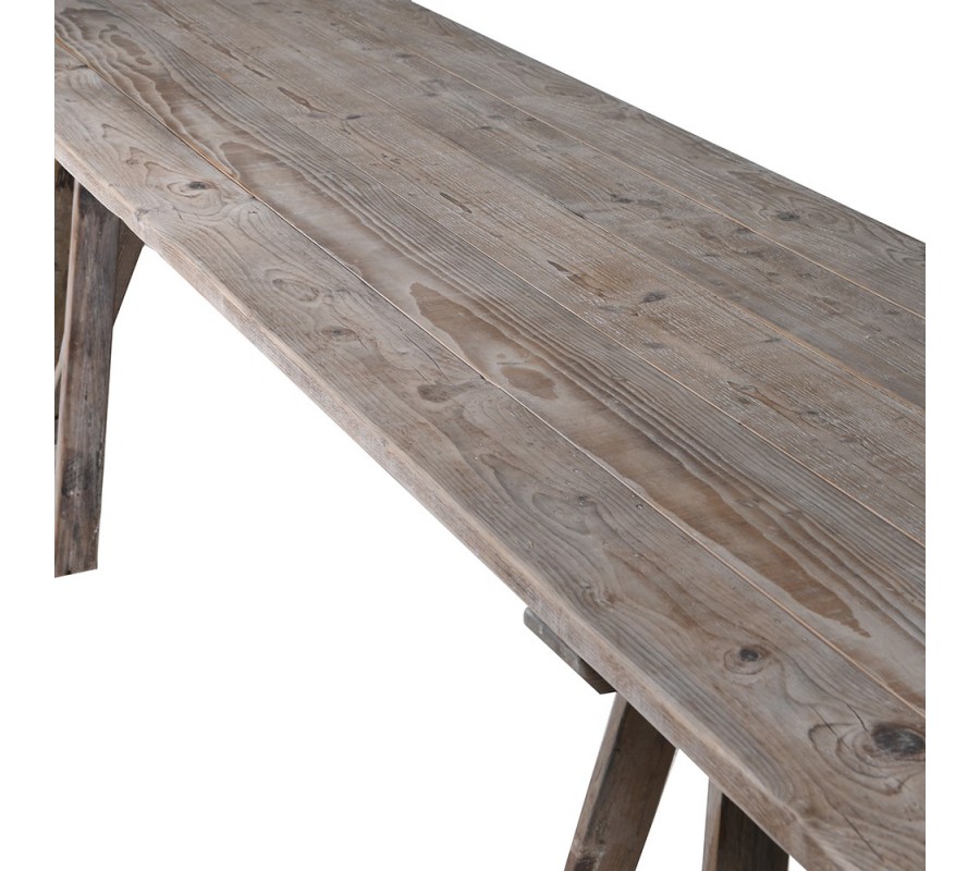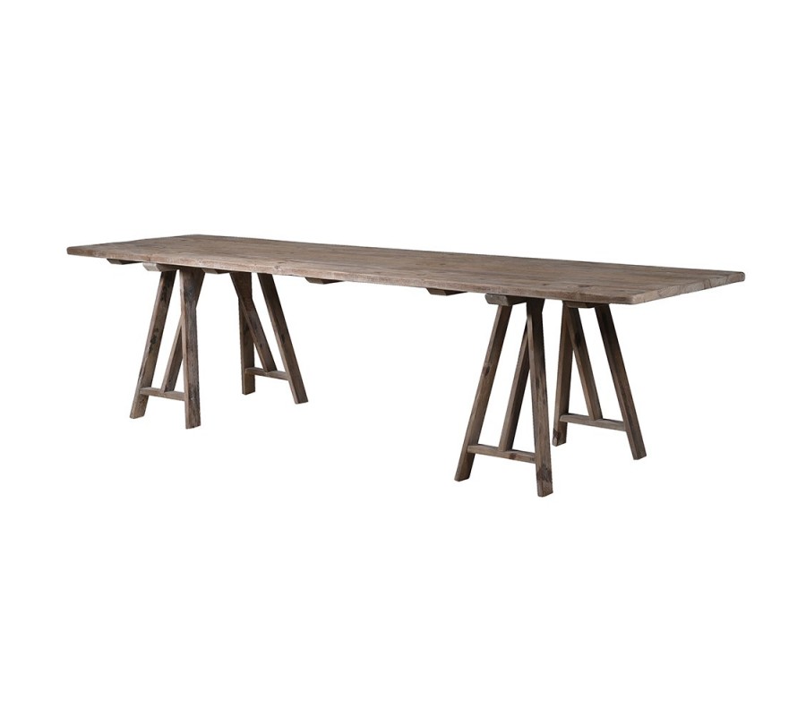 Konštrukcia pozostáva z masívnych nôh v podobe kozlových stojanov, ktoré sú pevné a stabilné, pričom dodávajú stolu remeselný a autentický vzhľad. Štýl je rustikálny, ideálny do priestorov s vidieckym, vintage alebo industriálnym nádychom. Stôl sa hodí do veľkých jedální alebo otvorených kuchynských priestorov, kde je dostatok miesta na jeho plné využitie.