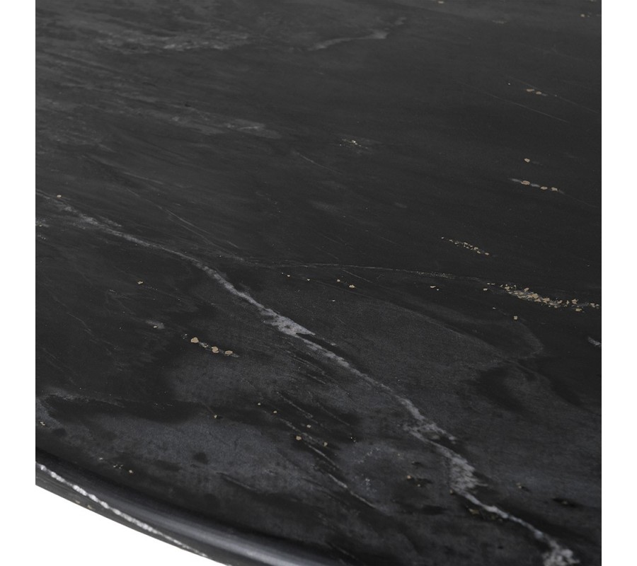 Vrchná doska stola je vyrobená z mramoru v čiernej farbe, ktorý prináša do dizajnu nádych luxusu. Zdobí ho minimalistická kresba v odtieňoch bielej a sivej, ktorá robí z vrchnej dosky elegantný dekoračný prvok miestnosti. Mramor je zároveň mimoriadne odolný a zaručí vám dlhodobú trvácnosť nábytku.