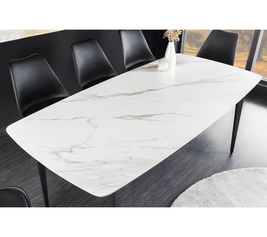 Štýlový obdĺžnikový mramorový jedálenský stôl Tazer s bielou keramickou doskou a sivými žilkami a čiernymi nožičkami 180 cm