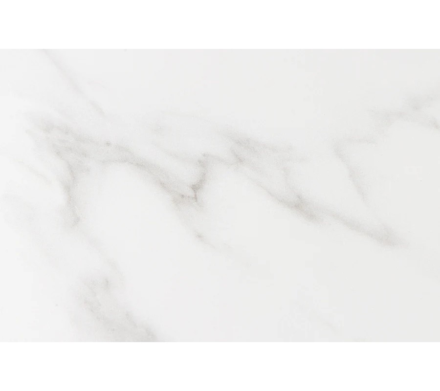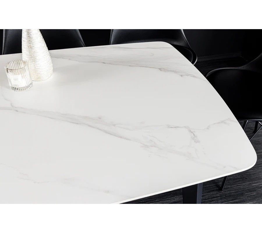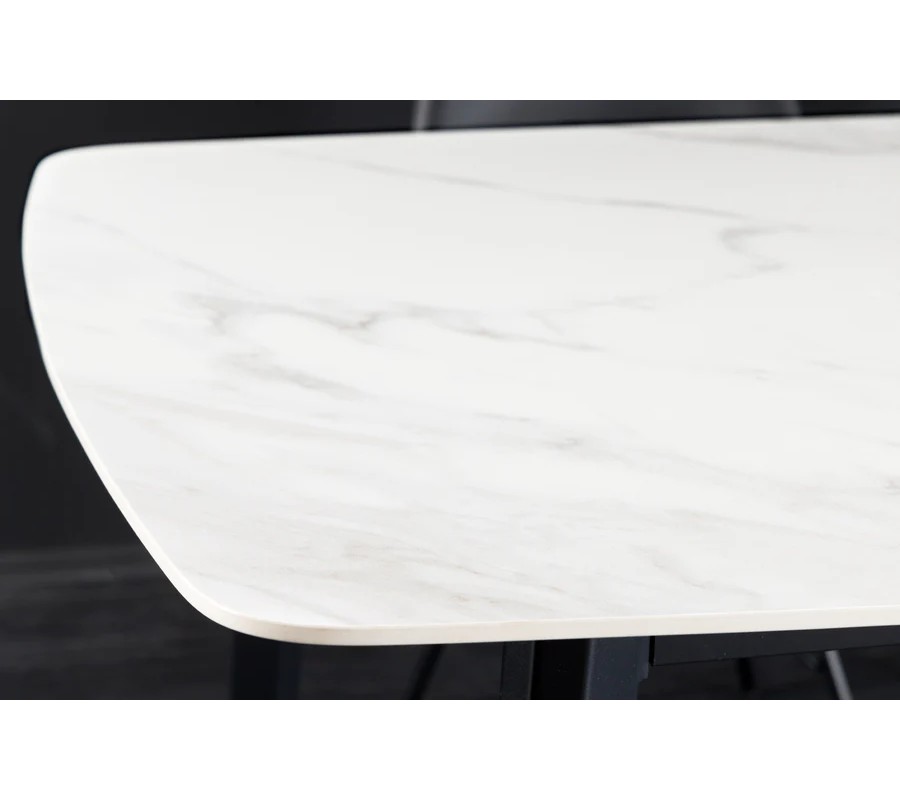 Jedálenský stôl s keramickou vrchnou doskou je v bielej farbe s jemnými sivými žilkami, ktoré imitujú elegantný mramorový dizajn. Doska má obdĺžnikový tvar s jemne zaoblenými rohmi, čo zjemňuje jeho vzhľad a dodáva mu moderný charakter.