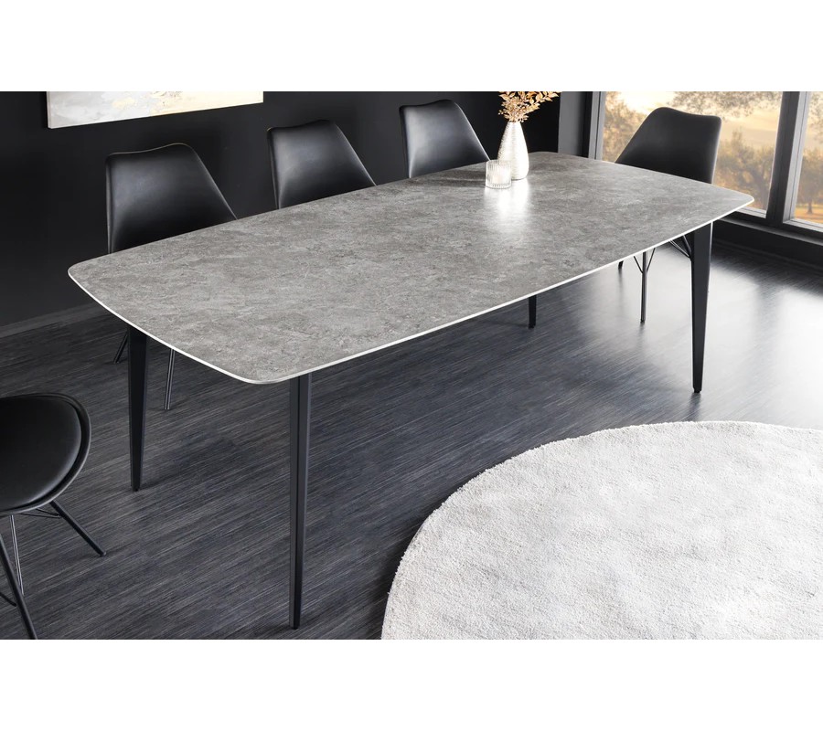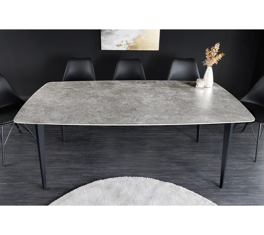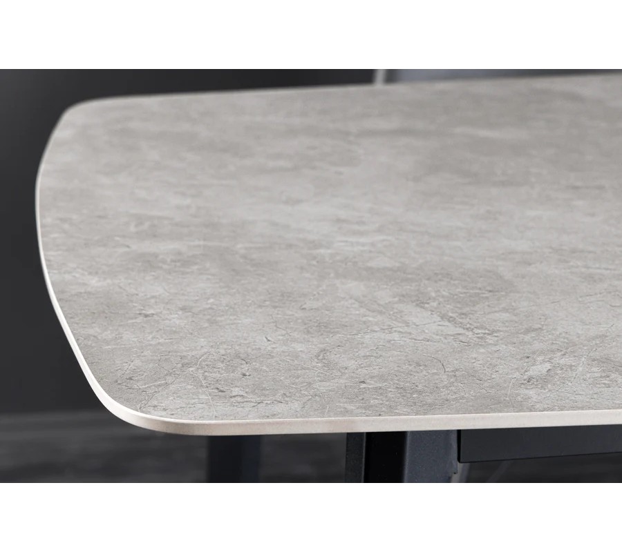 Jedálenský stôl s keramickou vrchnou doskou, ktorá má elegantný mramorový dizajn v sivých tónoch s jemnými žilkami, pôsobí moderným a sofistikovaným dojmom. Povrch dosky je hladký, odolný a vhodný pre každodenné používanie. Doska má jemne zaoblený obdĺžnikový tvar, ktorý dodáva stolu nadčasovú estetiku.