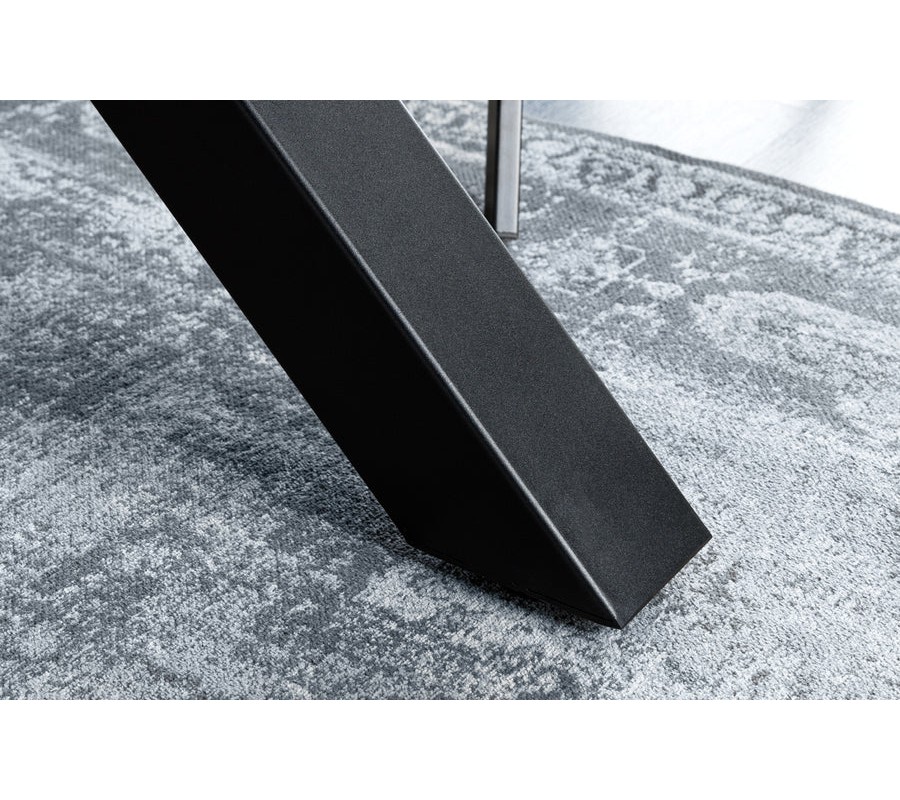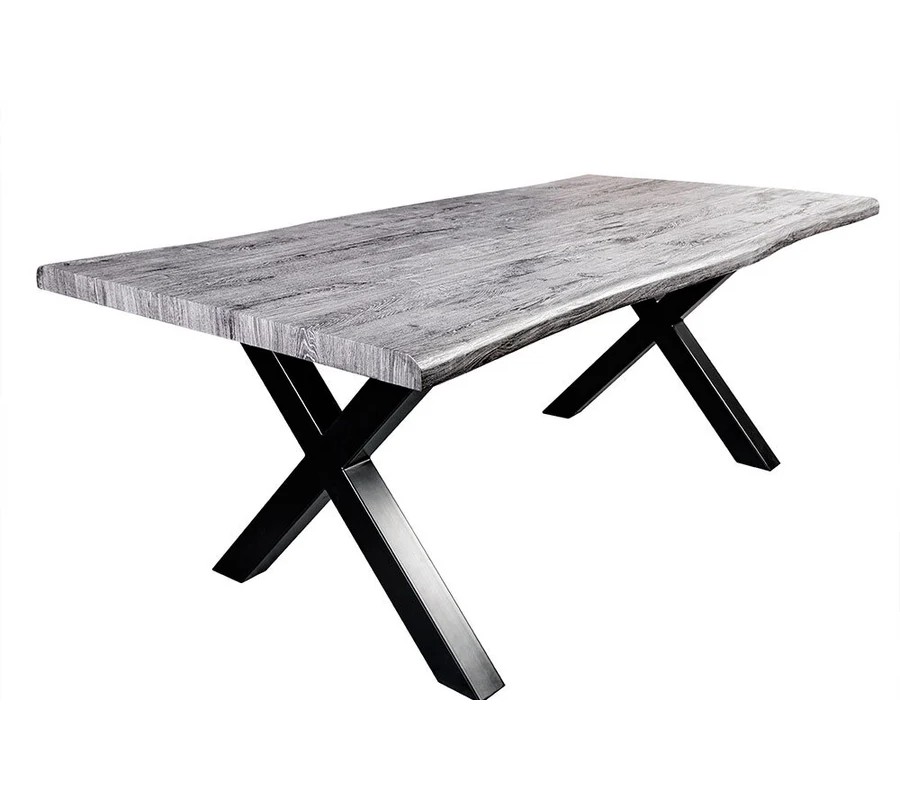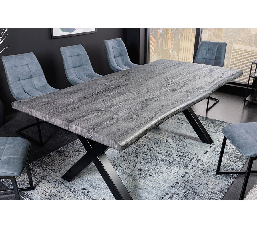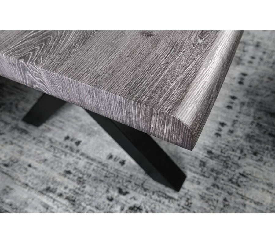 Masívny jedálenský stôl vyrobený z kvalitného dyhovaného dreva s dubovým dizajnom kombinuje prírodnú krásu s moderným dizajnom. Stolová doska má prirodzený nepravidelný tvar pripomínajúci živý okraj, čím pôsobí autenticky a prirodzene. Povrch dreva je upravený v sivom odtieni s jemnou textúrou, ktorá zvýrazňuje štruktúru dubového dreva a dodáva mu jedinečný charakter. Stabilné nožičky v tvare písmena X sú z pevného čierneho kovu s matným povrchom, čo vytvára moderný kontrast k prírodnému drevu.