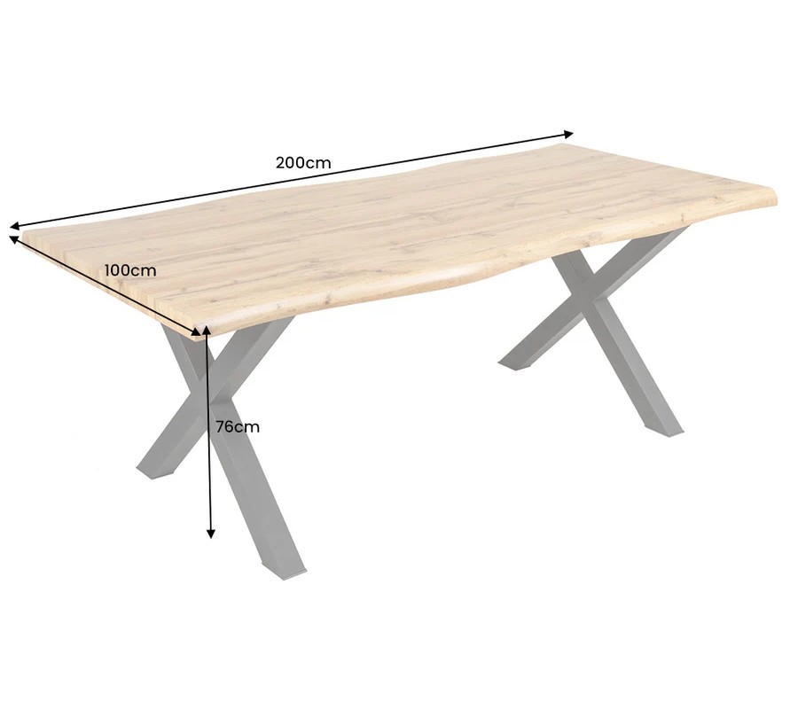 Jedálenský stôl má obdĺžnikovú dosku so vzhľadom masívneho dubového dreva, ktorá je prirodzene tvarovaná s mierne nepravidelnými okrajmi, čo zdôrazňuje jeho autentickosť. Povrch je jemne brúsený a ošetrený lakom, čím sa zachováva štruktúra dreva a zároveň sa zvyšuje jeho odolnosť. Drevo má prírodný svetlohnedý odtieň s viditeľnou kresbou.