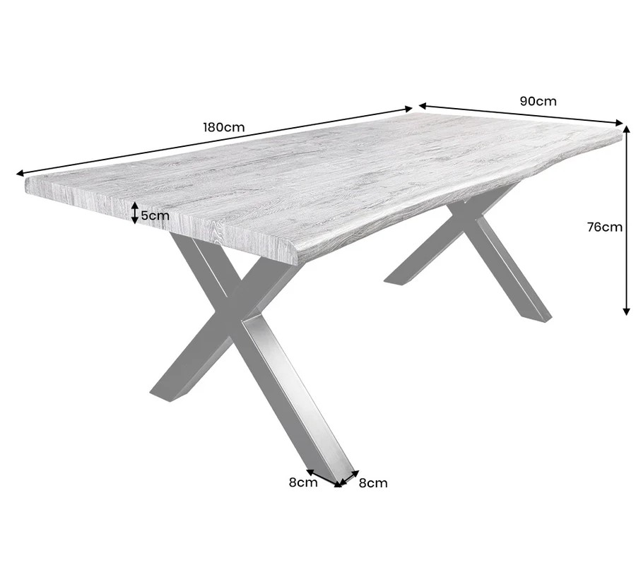 Stôl s dĺžkou 180 cm poskytuje pohodlný priestor na sedenie pre 6 až 8 osôb, v závislosti od typu stoličiek. Vhodný je do moderných, industriálnych alebo minimalistických interiérov. Skvelo sa kombinuje s čiernymi alebo kovovými stoličkami a doplnkami z prírodných materiálov, ako sú ľanové obrúsky, drevené misy alebo koberce v neutrálnych farbách. Svojím dizajnom vytvára dominantný prvok v jedálni, ktorý zaujme na prvý pohľad.