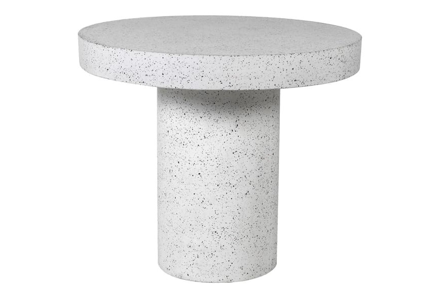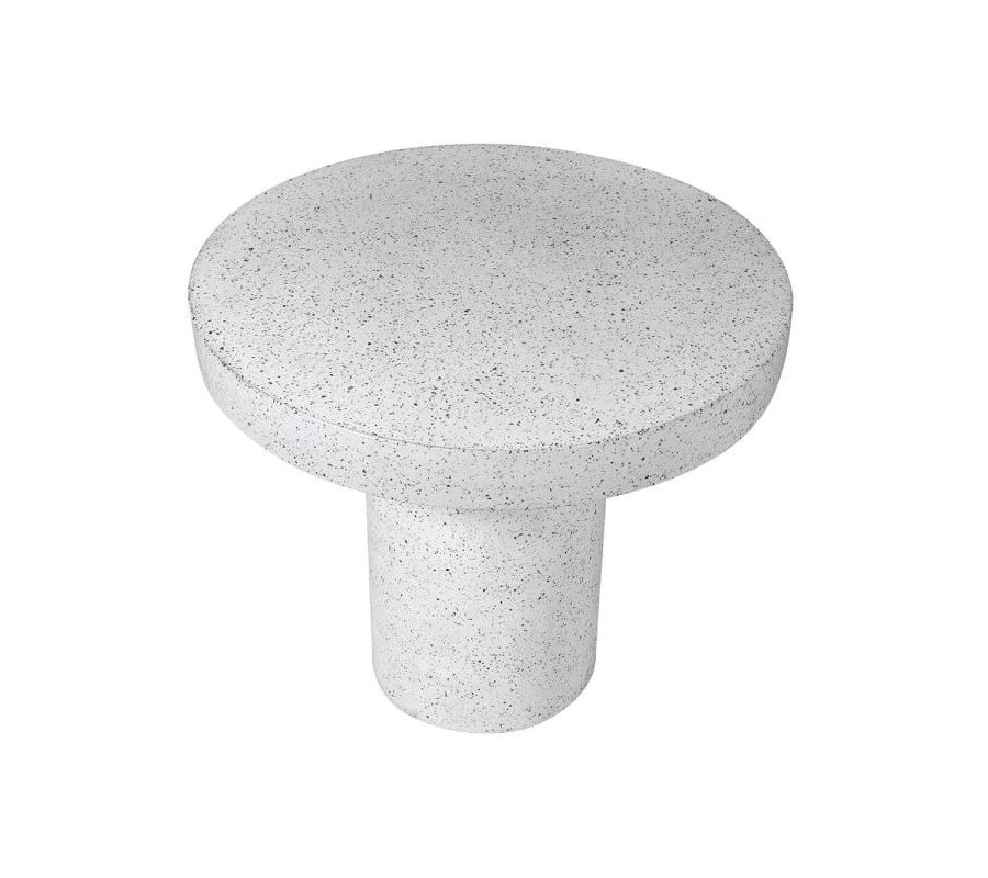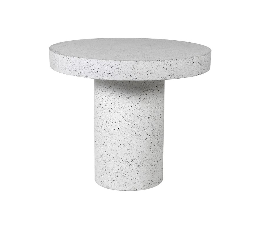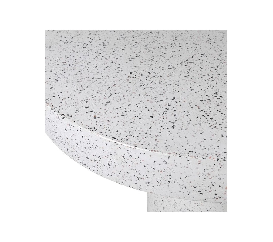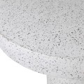 Jedálenský stôl Terazzo má jednoduchý a elegantný okrúhly tvar, ktorý podporuje priateľskú atmosféru pri stolovaní. Vyrobený je z terazza, materiálu známeho svojou pevnosťou a odolnosťou, s hladkým matným povrchom a jemnou štruktúrou, ktorú tvoria drobné čierne bodky na svetlom bielom základe. Unikátna textúra dodáva stolu moderný a sofistikovaný vzhľad.