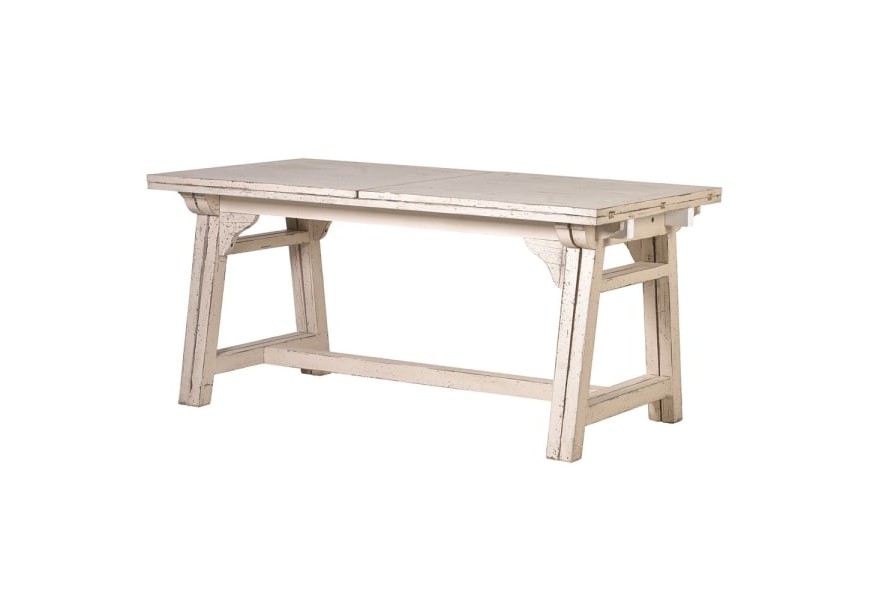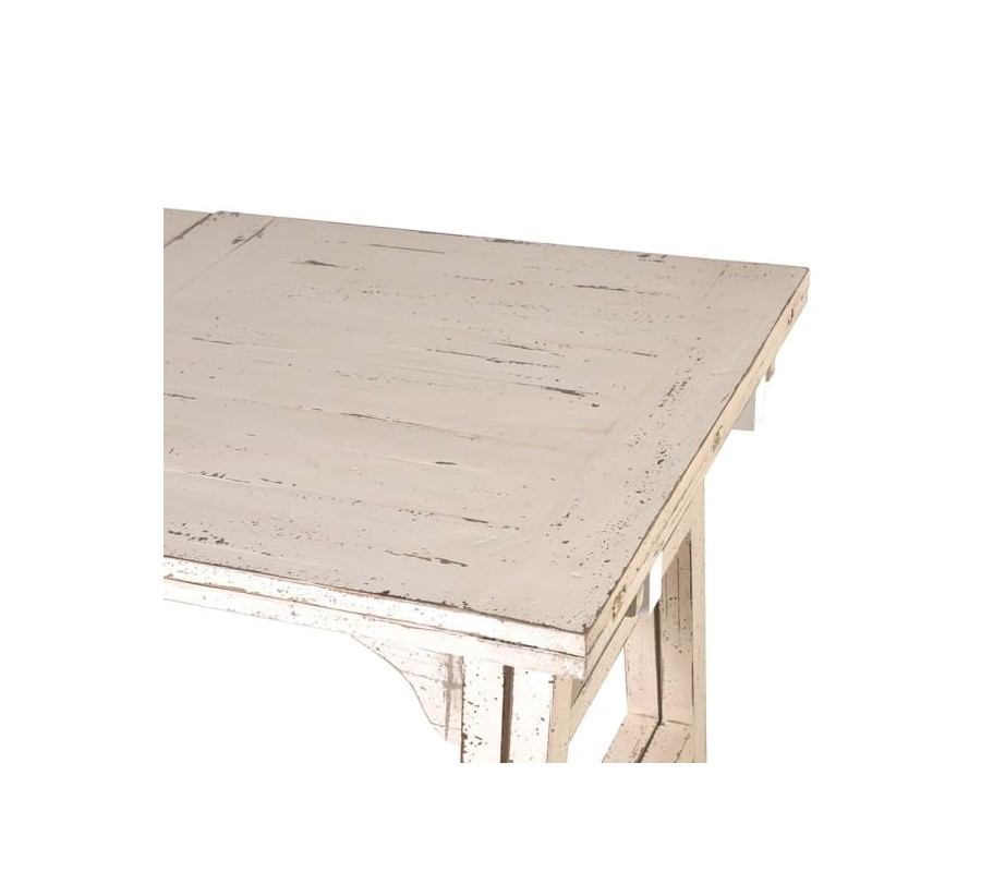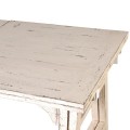 Rozkladací jedálenský stôl Ston má obdĺžnikový tvar s pevným, robustným vzhľadom. Povrch stola je upravený v jemnej bielej farbe s efektom opotrebovania, ktorý pripomína vintage alebo vidiecky štýl. Táto povrchová úprava dodáva stolu charakter a autentický vzhľad.