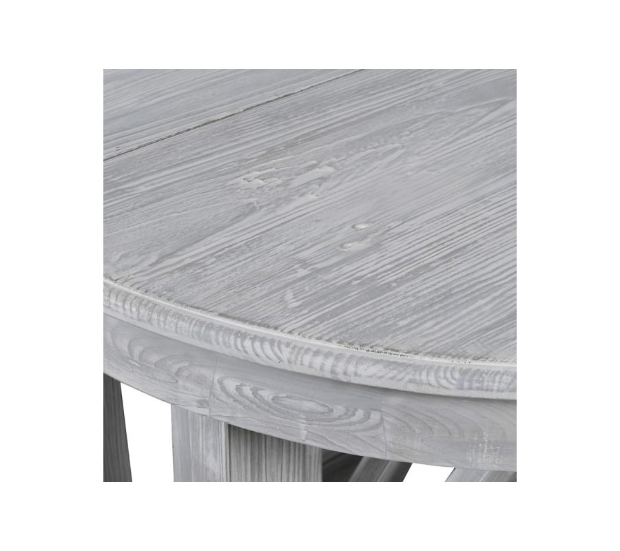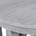 Stôl má masívne nohy s tvarom pripomínajúcim robustné krížové vzpery, ktoré dodávajú konštrukcii pevnosť a vizuálnu stabilitu. Nohy sú šedej farby s jemným patinovaným povrchom, ktorý zvýrazňuje prirodzenú štruktúru dreva. Povrch stola je jemne brúsený s nádychom rustikálnej elegancie, ktorá sa hodí do vidieckeho alebo provensálskeho štýlu.
