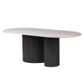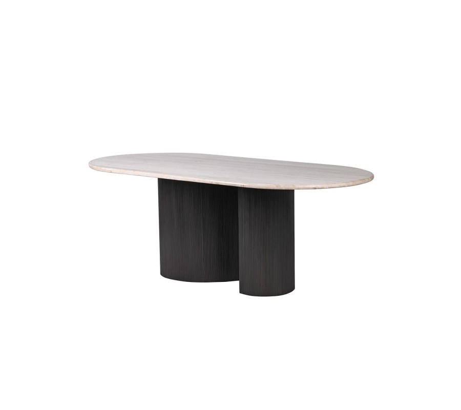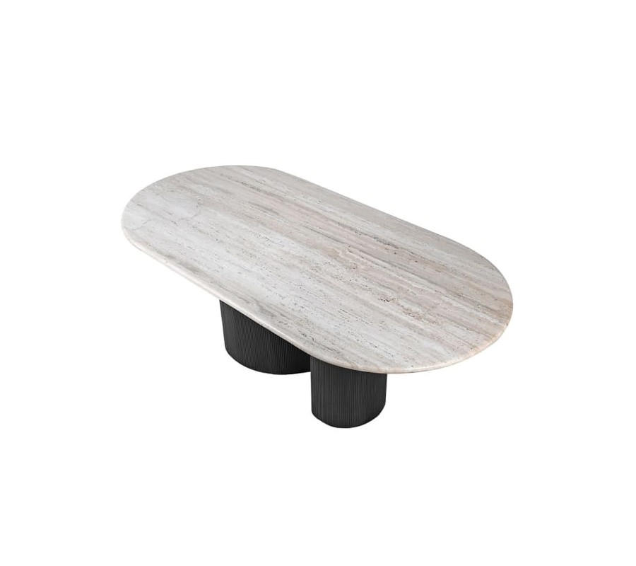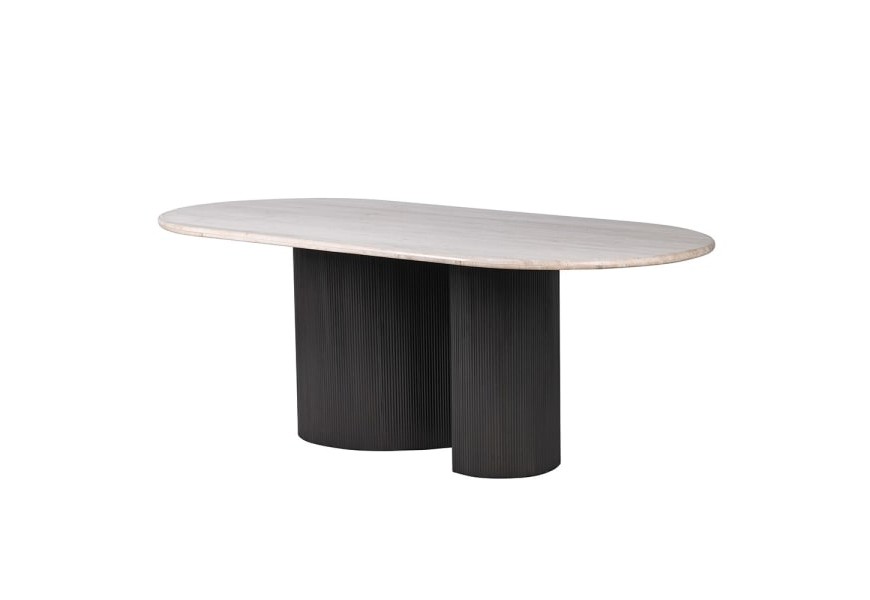Luxusný art deco oválny jedálenský stôl Traverte z travertínu v bielej farbe a s čiernou kovovou zakrivenou nohou 200 cm